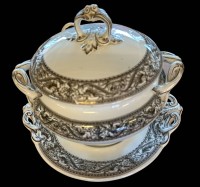 gr. Gründerzeit Terrine mit pass. Unterteller, ovale Fleischplatte "BWM&Co" Form Cellini, gut erhalten, ionnen Glasur etwas verfärbt, H-30 cm, B-33 cm, ovale Platte 33x26 cm