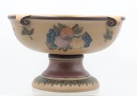gr. Fussschale, Regout, Petrus. Maastricht 1836 - 1899, Timor, bedruckt, von Hand ausgemalte Chinoiserien, Altersspuren, Altrissig, ca. H-10,5cm D-20cm