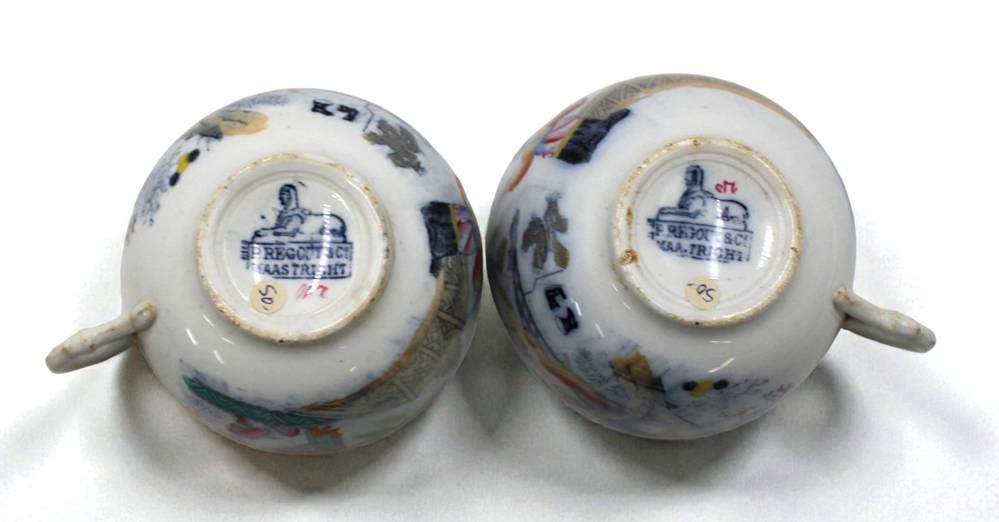 11x Serviceteile, Regout, Petrus. Maastricht 1836 - 1899, Timor, bedruckt, von Hand ausgemalte Chinoiserien, 7 Unterteller, x Tassen, sowie Mokkatasse mit U.T., Altersspuren, Tassen H-5-6cm [1]