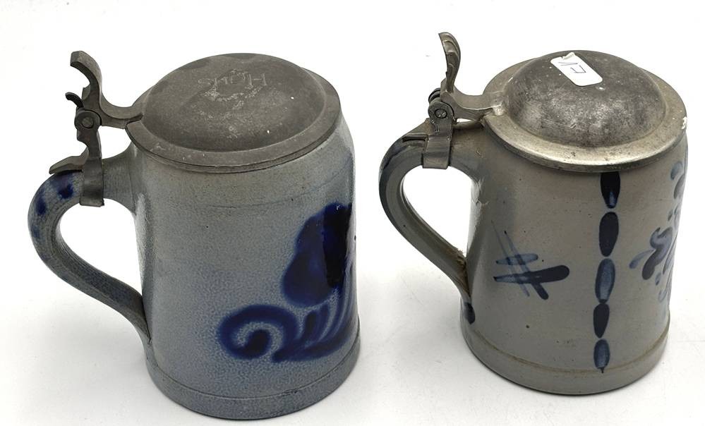 2x Bierkrüge, Blaumalerei, Zinndeckel, H-15 cm