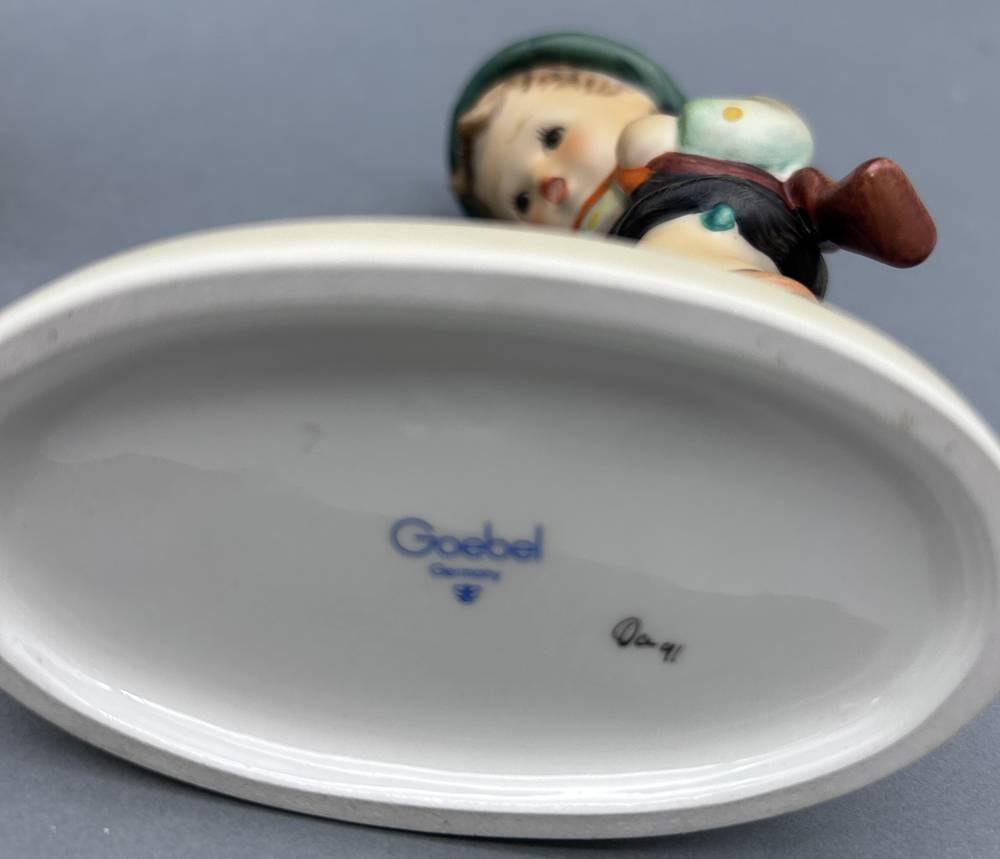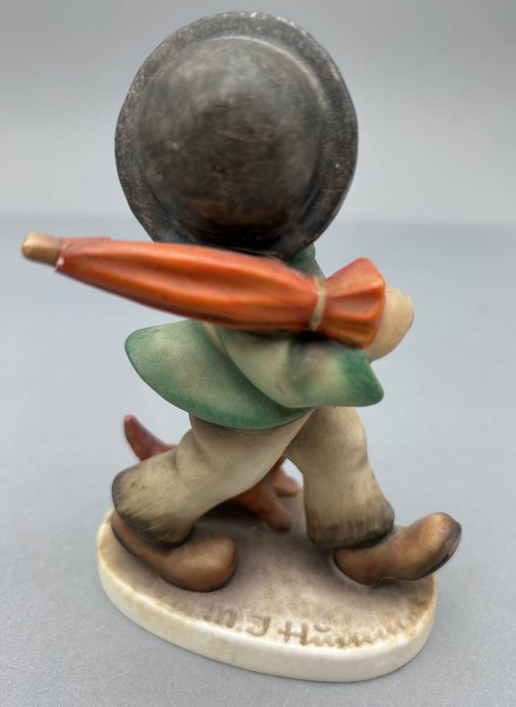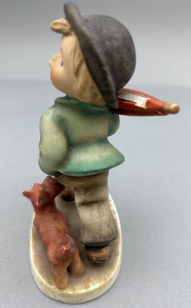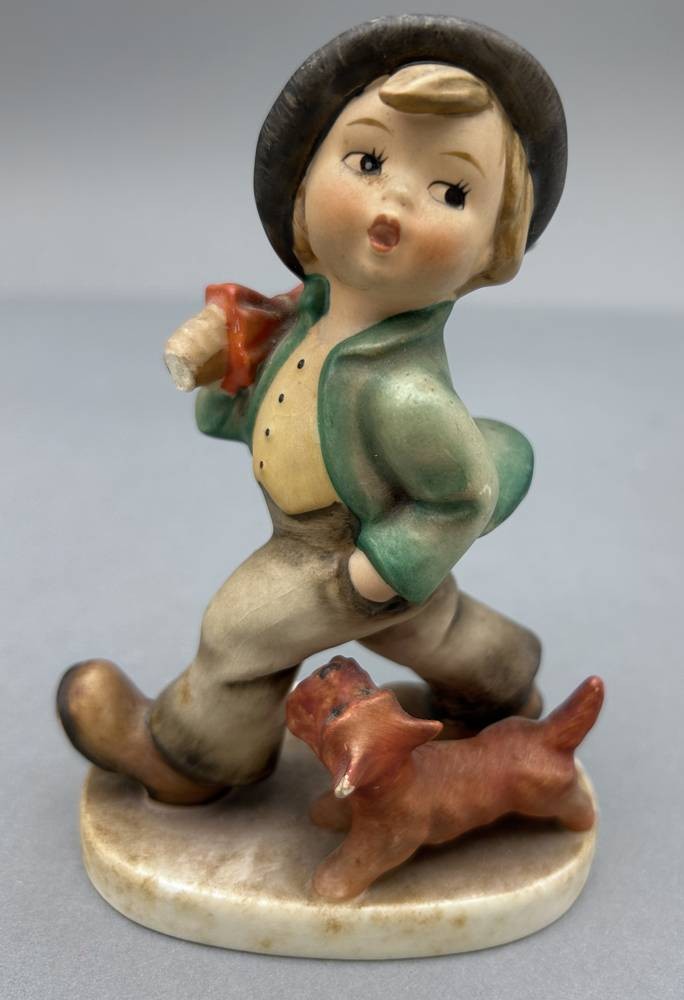 2x Hummel-Figuren, Jäger und Wanderbursche mit Hund bzw. Hasen, beide beschädigt, H-ca. 12 und 13 cm [1]