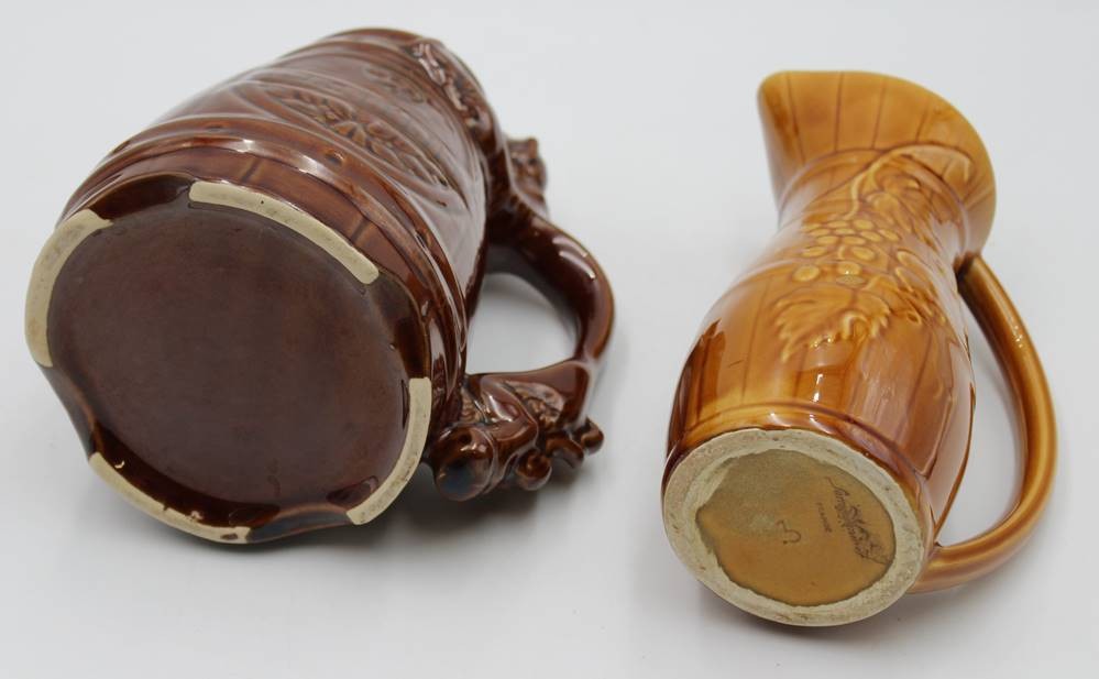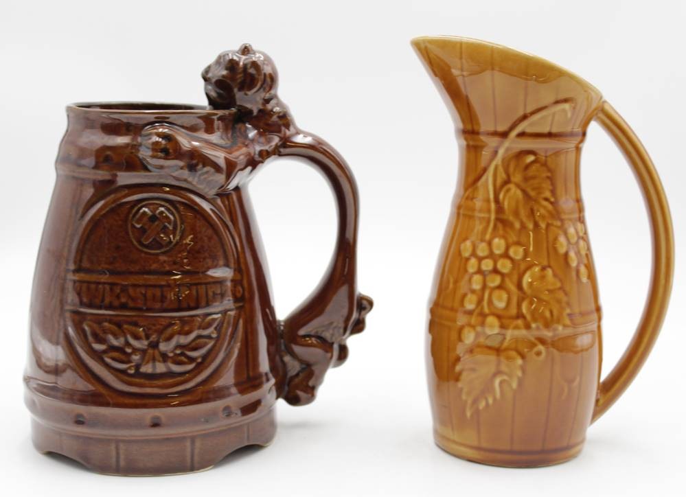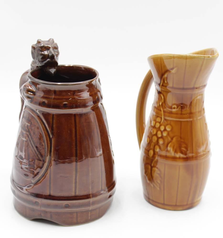 2x Krüge, 1x Saargmünd, älter, 1x Glasurfehler, ca. H-20cm. [1]