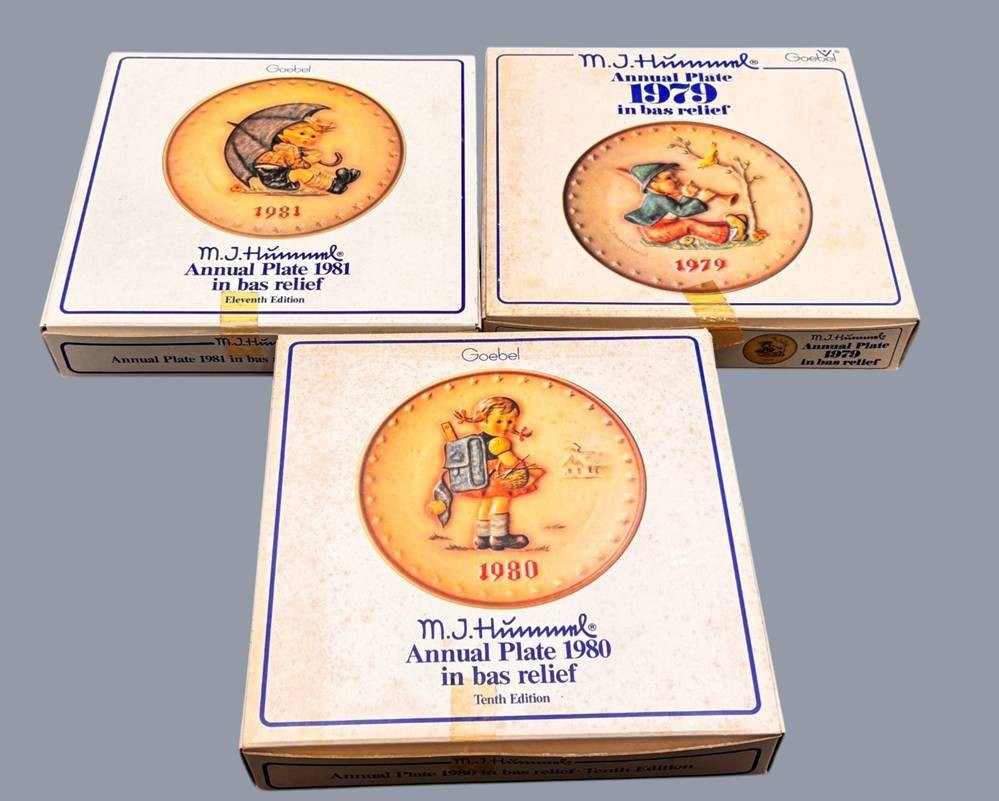 3 Goebel-Jahres-Teller mit Hummelmotiven, in OVP, 1979-80-81