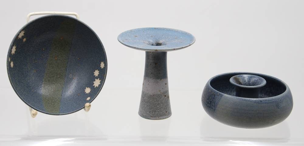 3 Teile Kunstkeramik, 2x Leuchter und eine Schale, gemarkt, ca. H-5 bis 11cm [1]