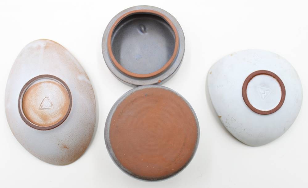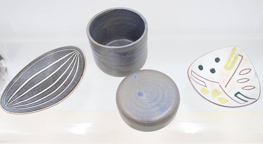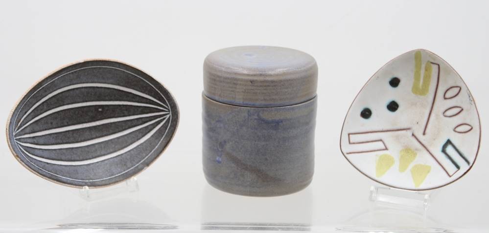 3tlg. Keramik-Konvolut, 50/60er Jahre, 2x gemarkt, 1x kl. Chip, Dose H-11,5cm, Schalen ca. L-12/16cm [1]