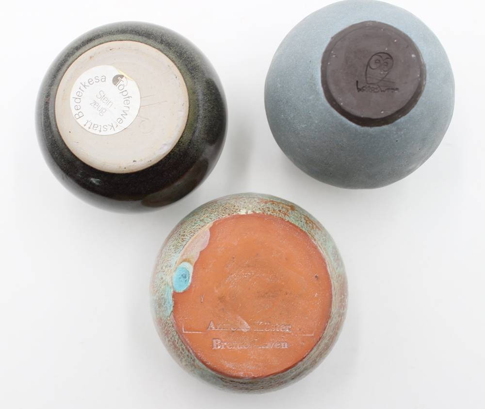 3x kl. Kunstkeramik-Vasen, je gemarkt, ca. H-6,8 bis 10,8cm [1]