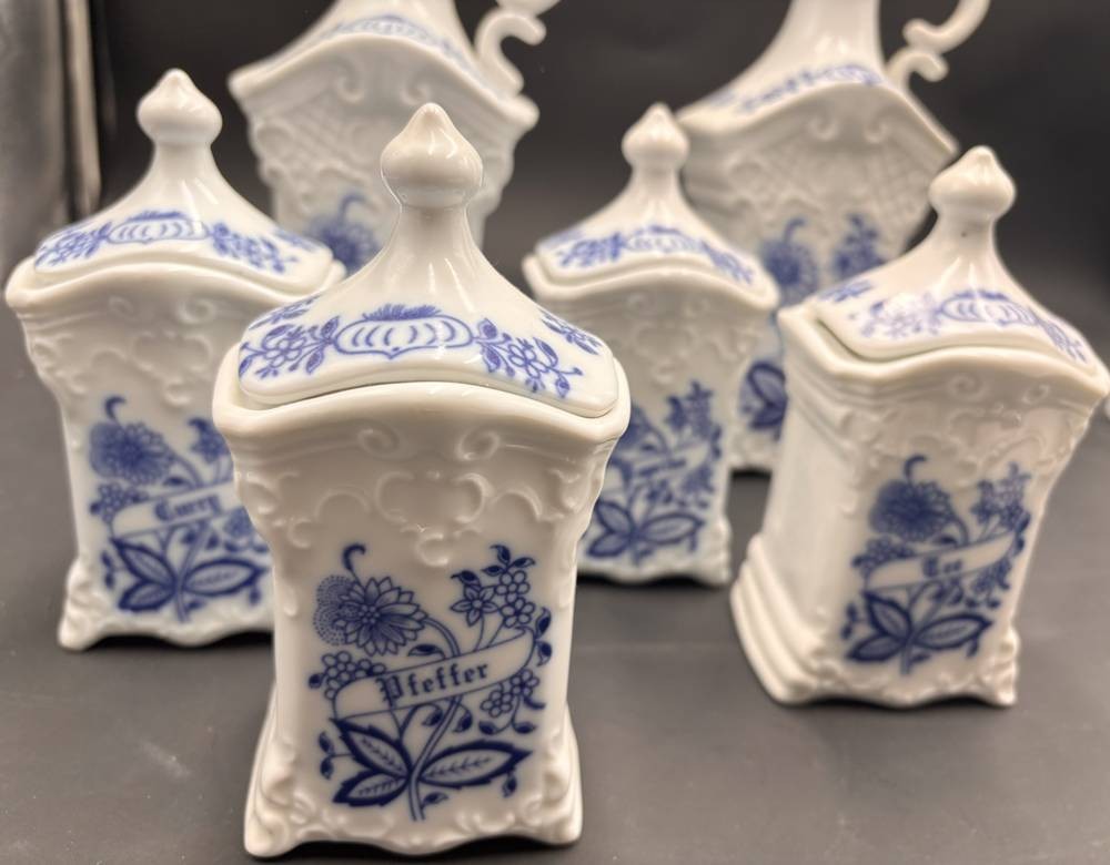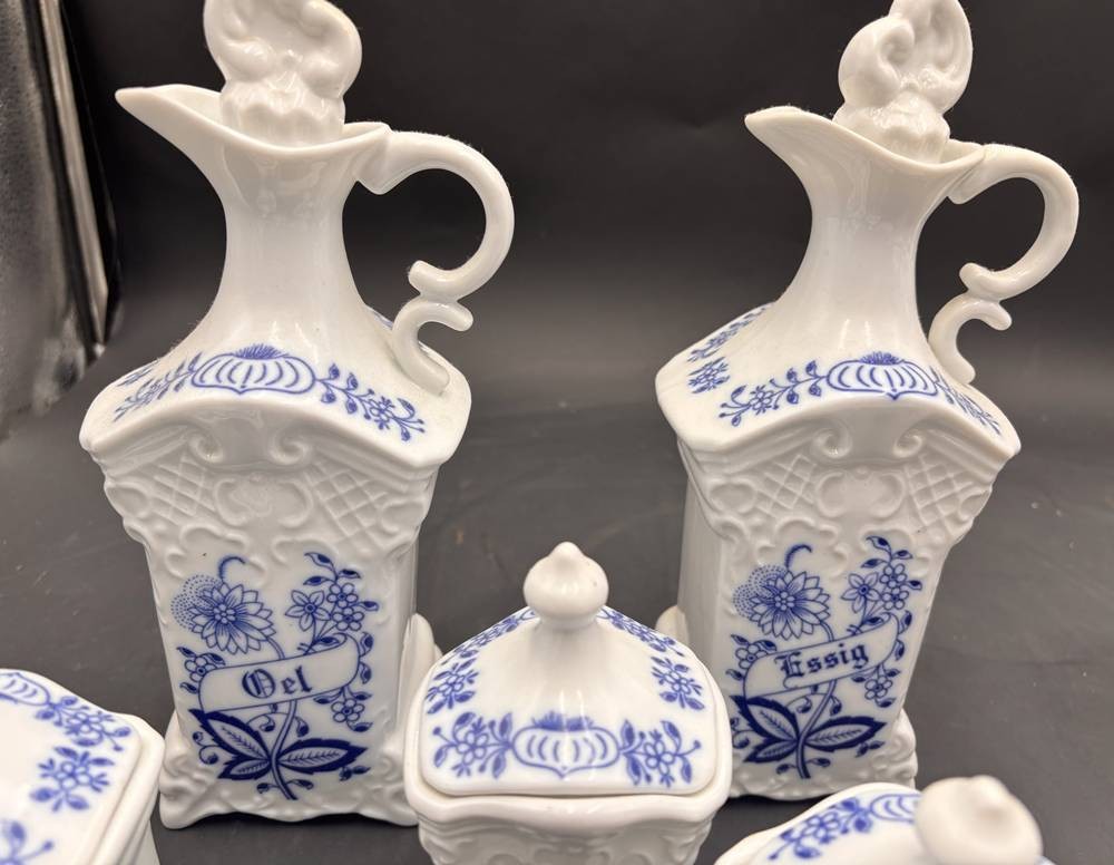 4x Küchengefässe und 2 Flaschen "Essig" und "Oel" 15 und 26 cm, deutsch beschriftet [1]