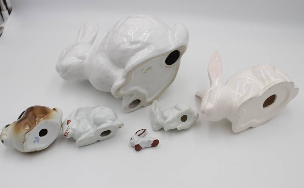 6x div. Hasen-Figuren, 1x gemarkt, Größter H-22cm.