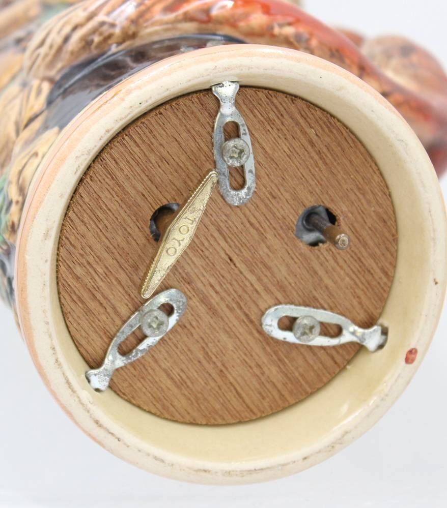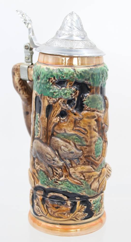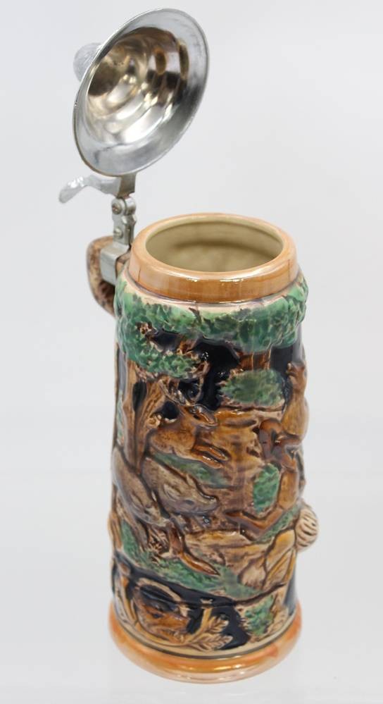 Bierkrug mit Spieluhr, älter, Reliefdekor, Fuchs als Griff, ca. H-24cm [1]