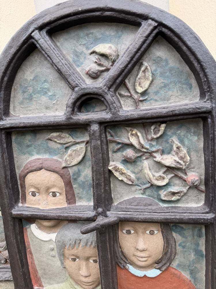 Christa Bartling (1940) Worpswede, gr. Keramik-Fenster mit Kindern, mbunt bemalt, verso CB geritzt, 62x44 cm [1]