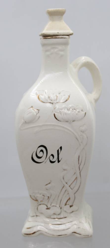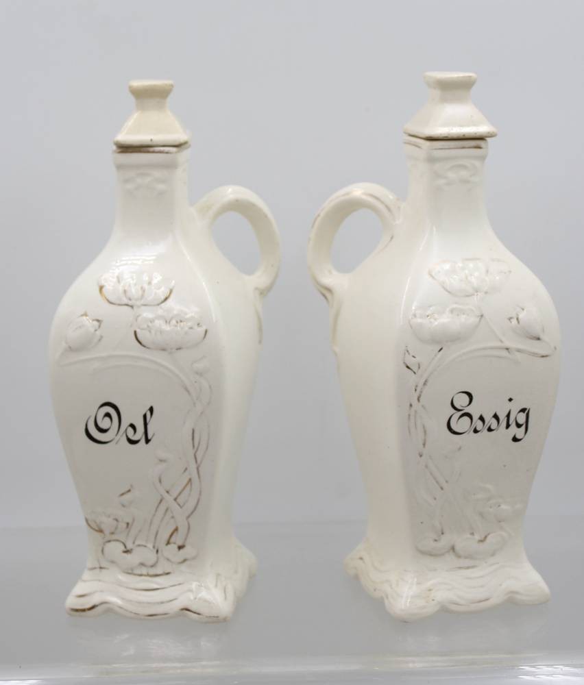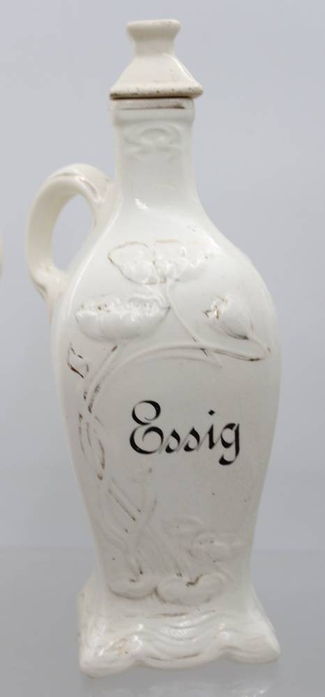 Essig und Oel, Jugendstil, Reliefdekor der Zeit, Goldbemalung stark berieben, Deckel 1x bestossen und wohl nicht original, ca. H-24cm [1]
