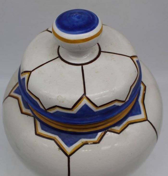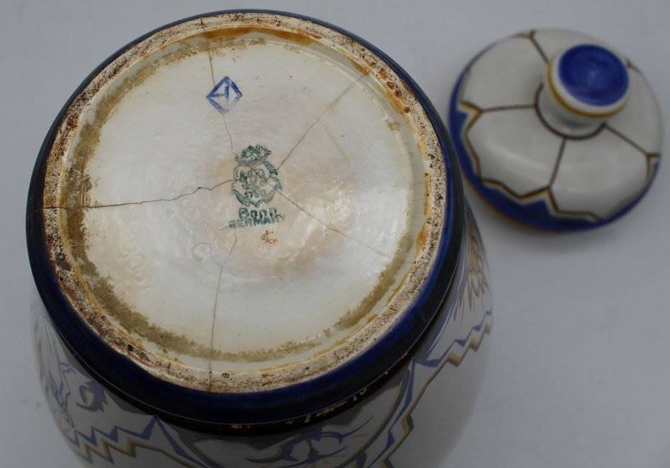 gr. Art Deco Deckelvase, Bonn, Rand mit Chips, Boden craquelliert, Altrisse, H-36 cm, B-23 cm [1]