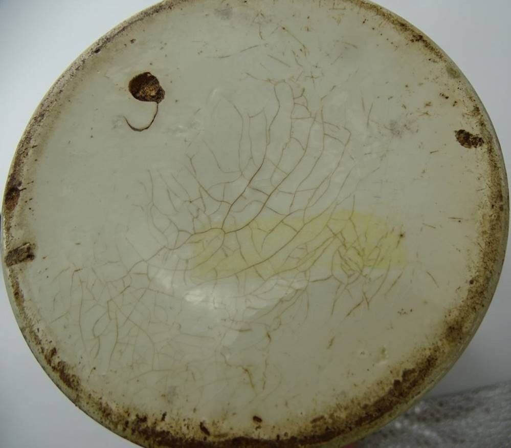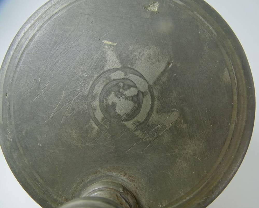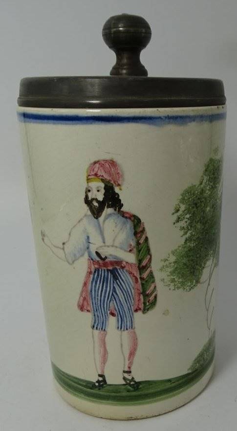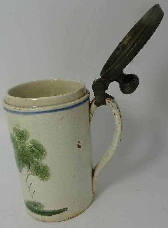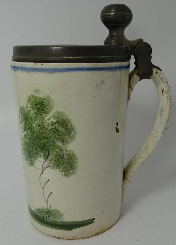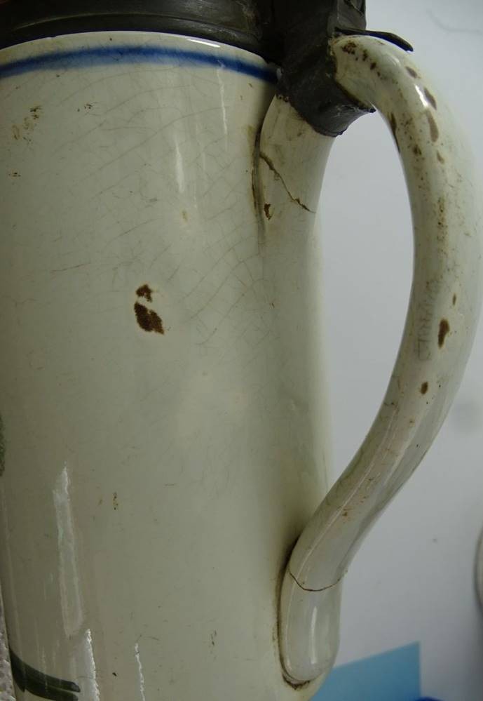 gr. Fayence Walzenkrug mit Zinndeckel, wohl 18.Jhd., H-21 cm, Henkel geklebt [1]