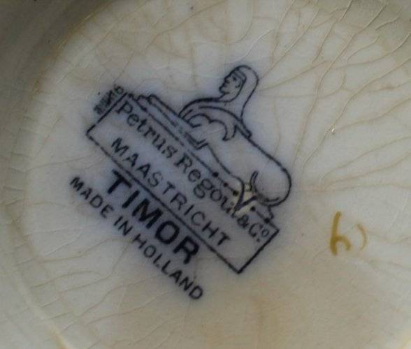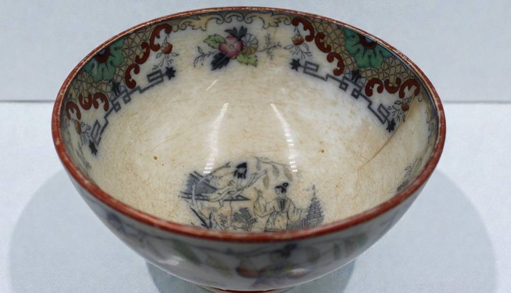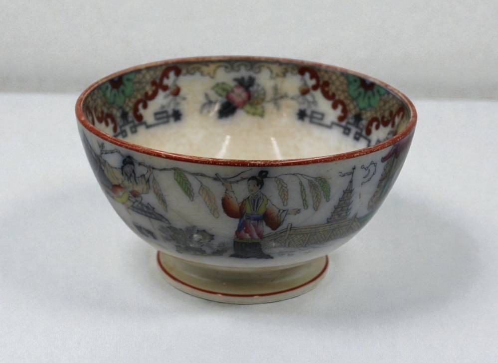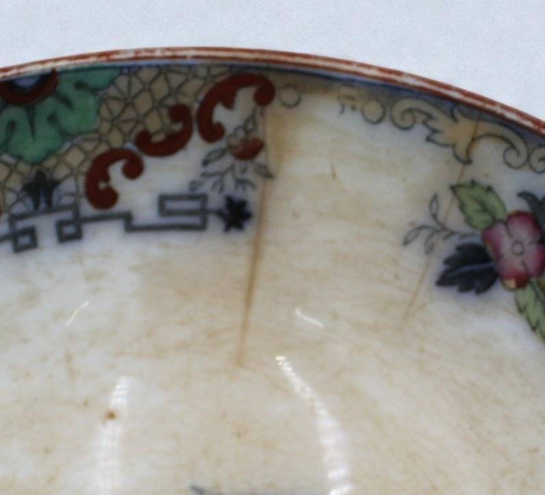 gr. Fussschale, Regout, Petrus. Maastricht 1836 - 1899, Timor, bedruckt, von Hand ausgemalte Chinoiserien, Altersspuren, Altrissig, ca. H-10,5cm D-20cm [1]