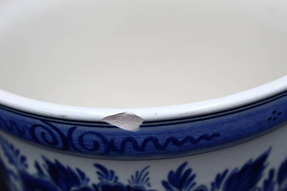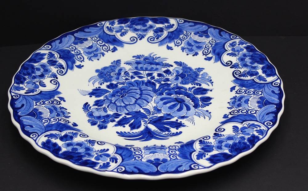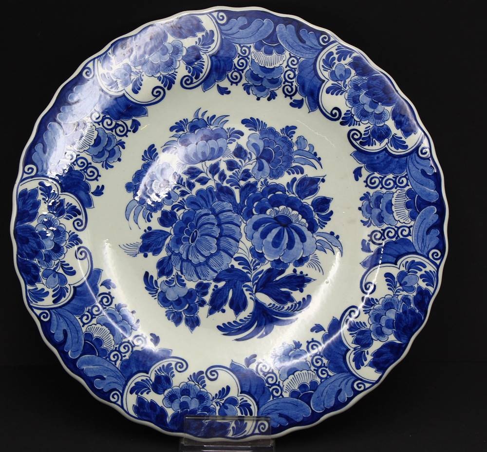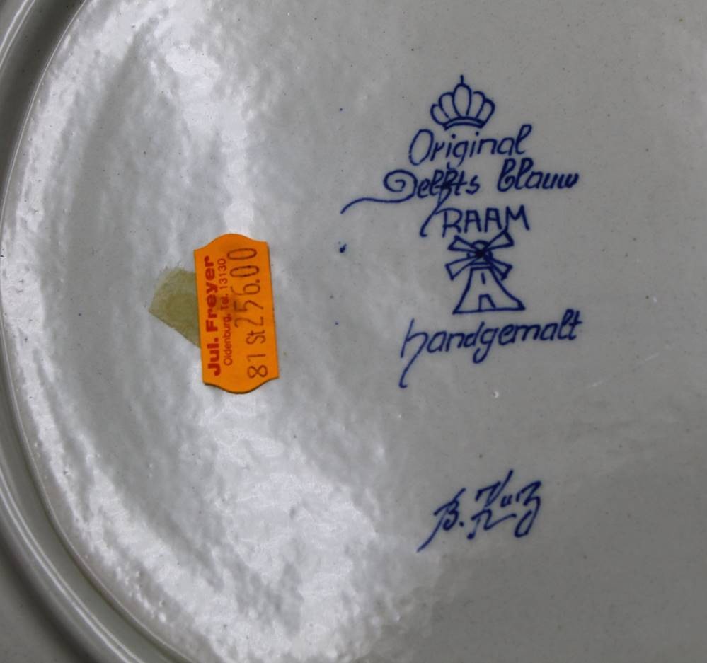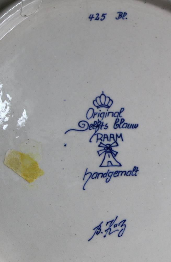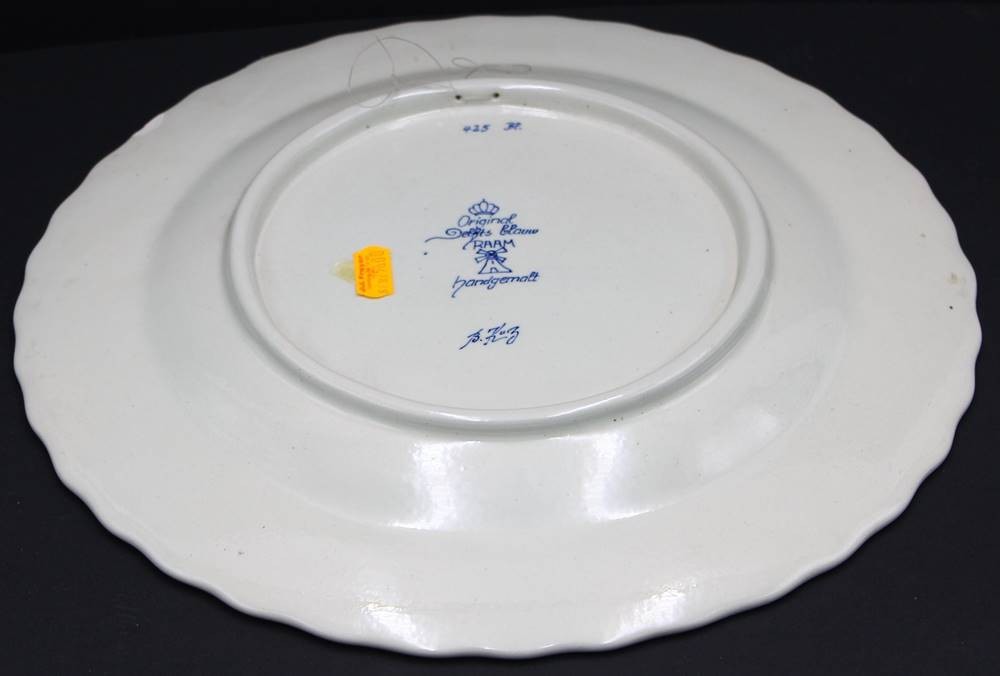 gr. Wandteller und gr. Schale (Blumenübertopf) Delft "RAAM" Blaumalerei, Teller Unterseite und Topfrand mit Chips, D-32 cm, H-16 cm, D-20 cm [1]