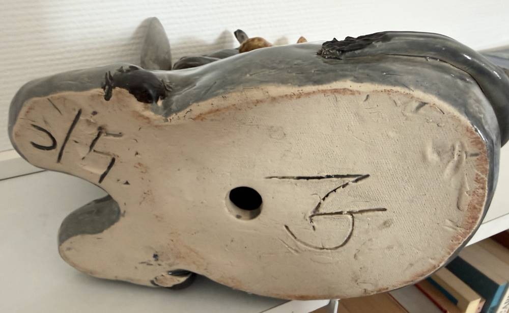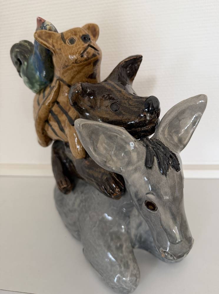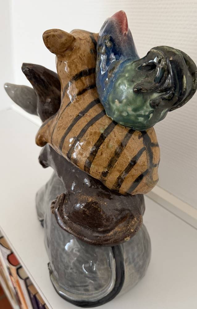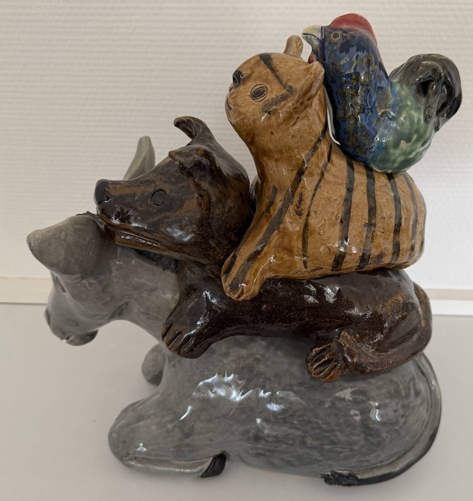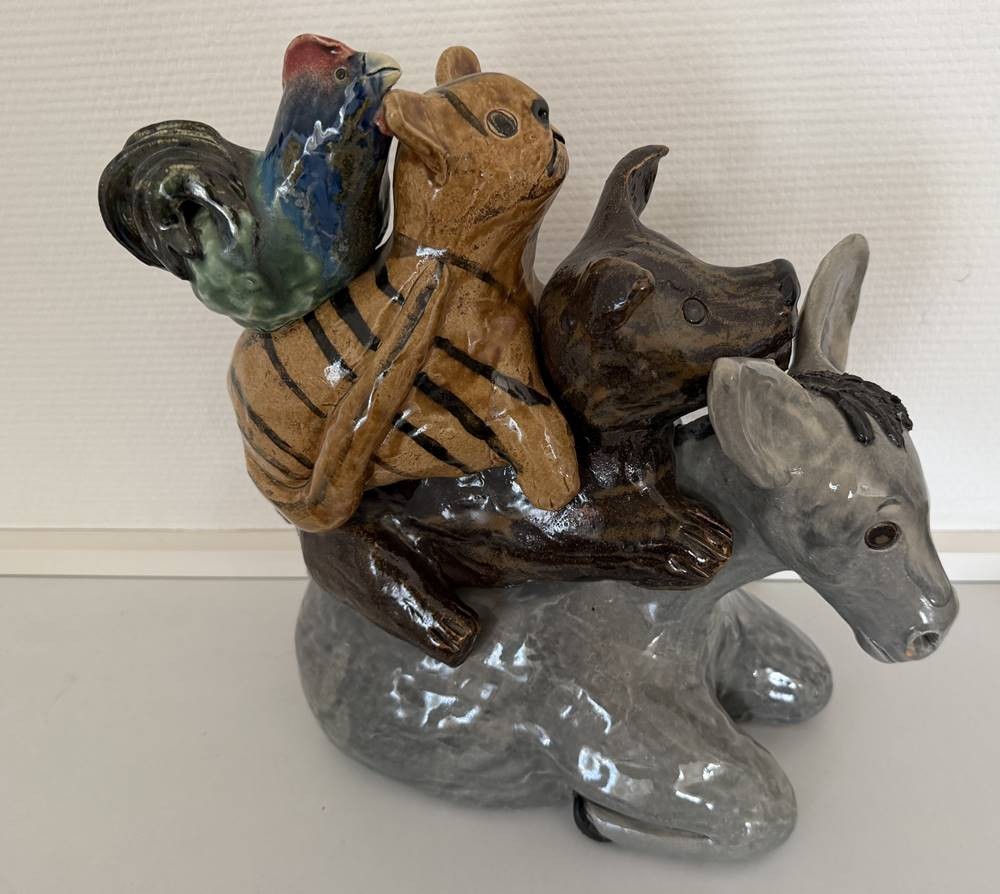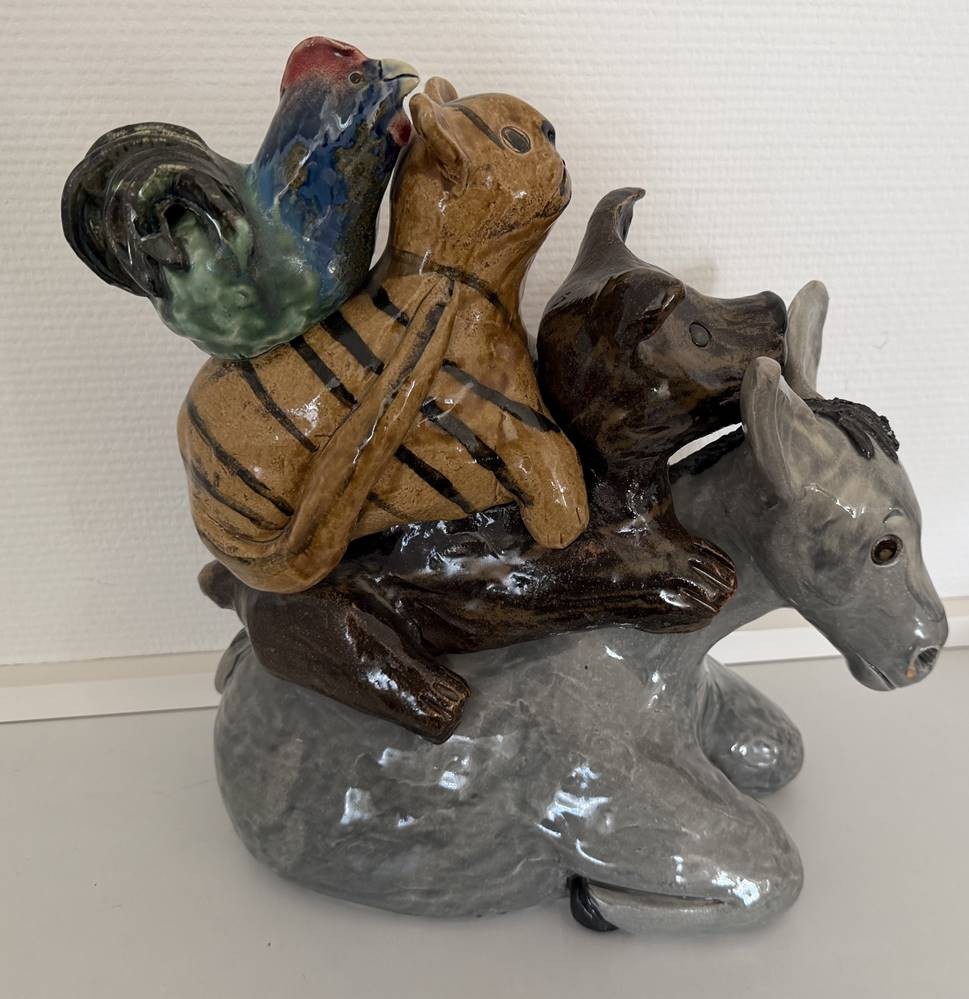 grosse, schwere Majolika-Gruppe, Die Bremer Stadtmusikanten, in Boden nummeriert und Monogrammiert "GN" ?, gut erhalten, H-33 cm, L-31 cm, gut erhalten [1]