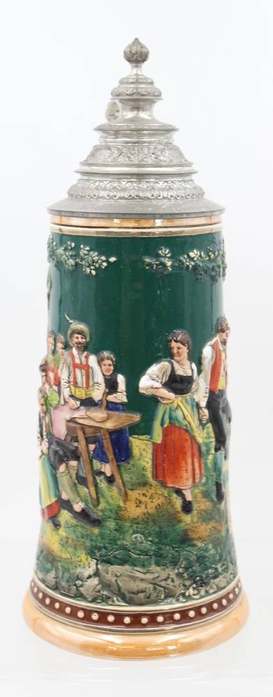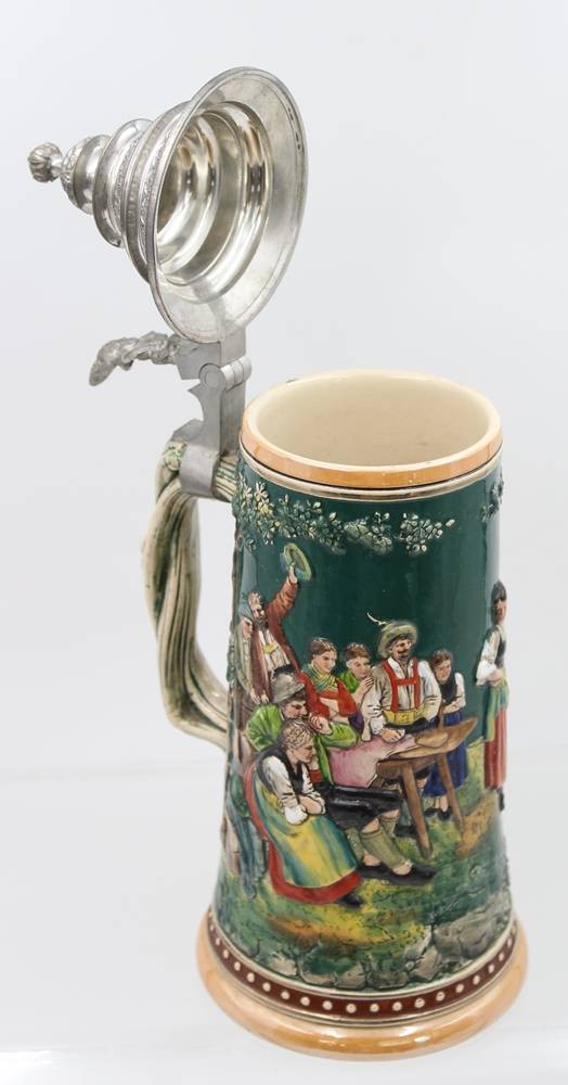hoher reliefierter Bierkrug, älter, Zinndeckel mit Gravur "Andenken an Chiemsee", ca. H-32cm