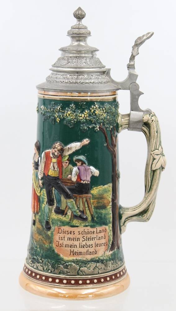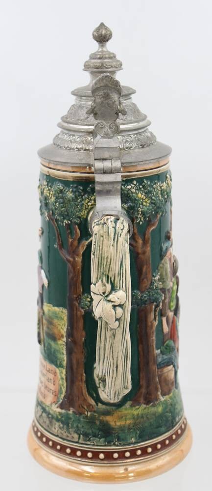 hoher reliefierter Bierkrug, älter, Zinndeckel mit Gravur "Andenken an Chiemsee", ca. H-32cm [1]