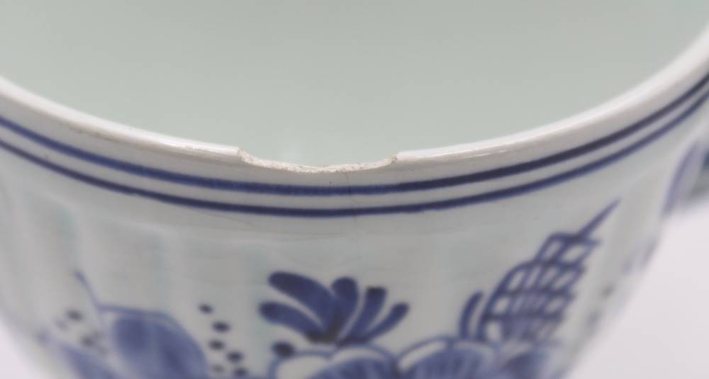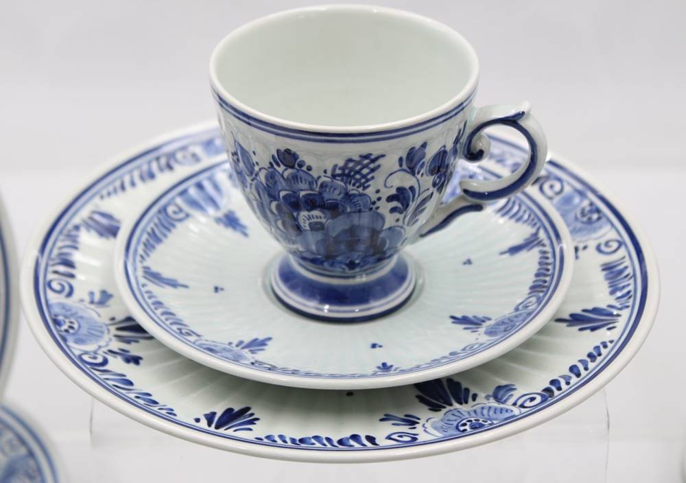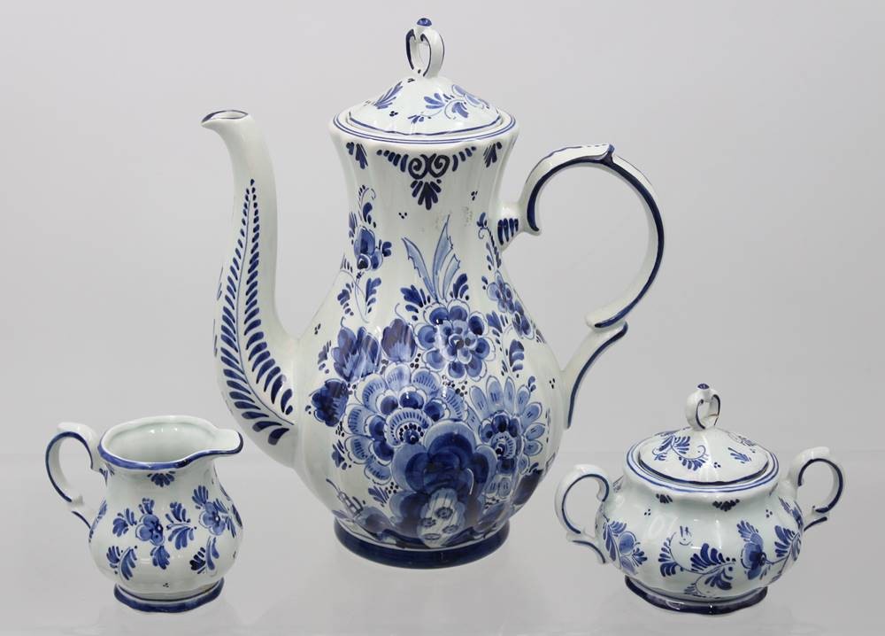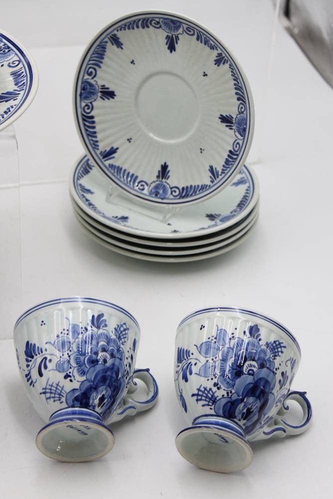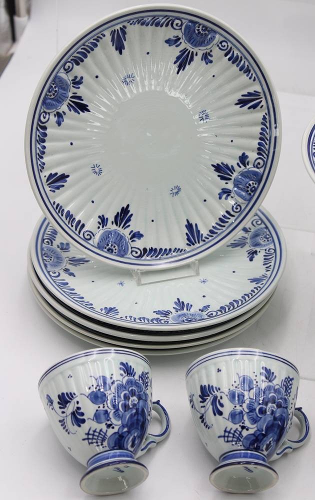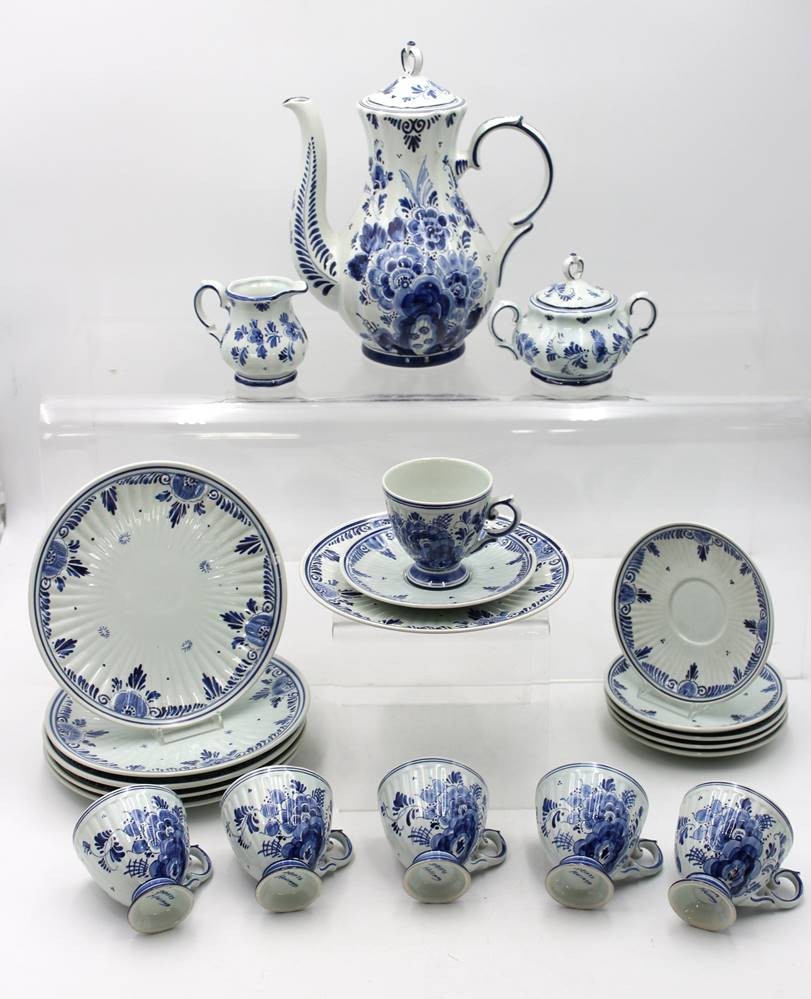 Kaffeeservice für 6 Personen, Delfts, florale Blaumalerei, 1x Tasse bestossen, ca. H-25,5cm Tassen ca. H-7,5cm [1]