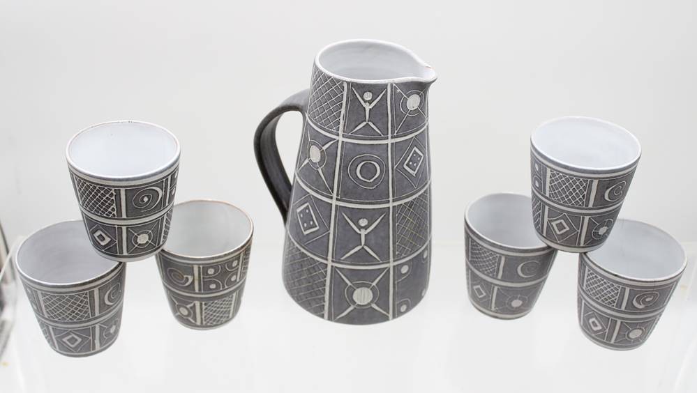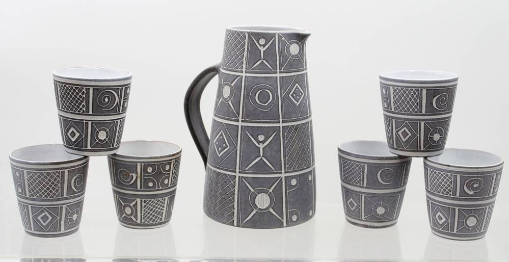 Keramik-Krugset, Modell 339, der Kunsttöpferei Marschner, Krug mit 6 Bechern, 1x Becher gerissen, Krug H-19,5cm [1]