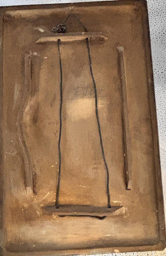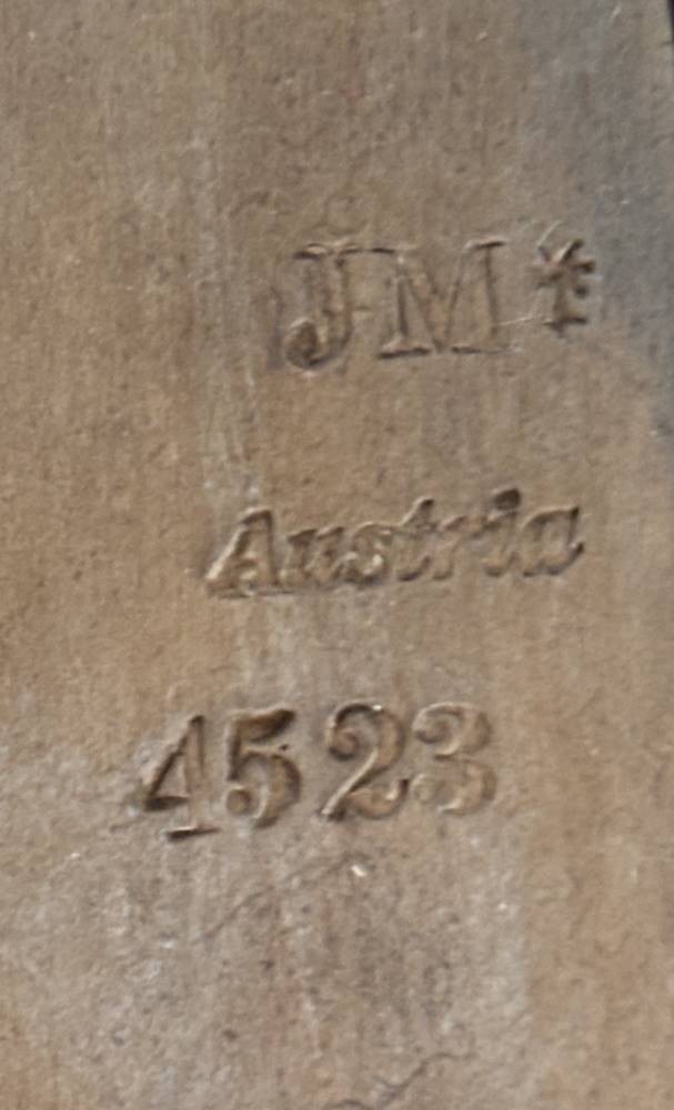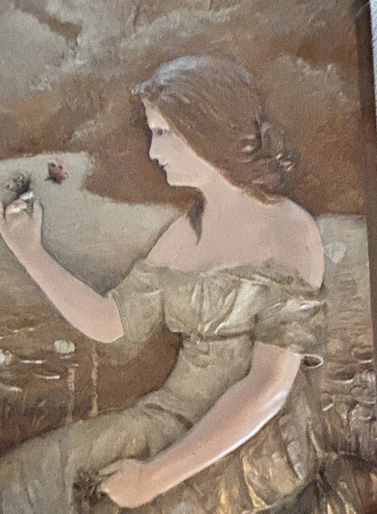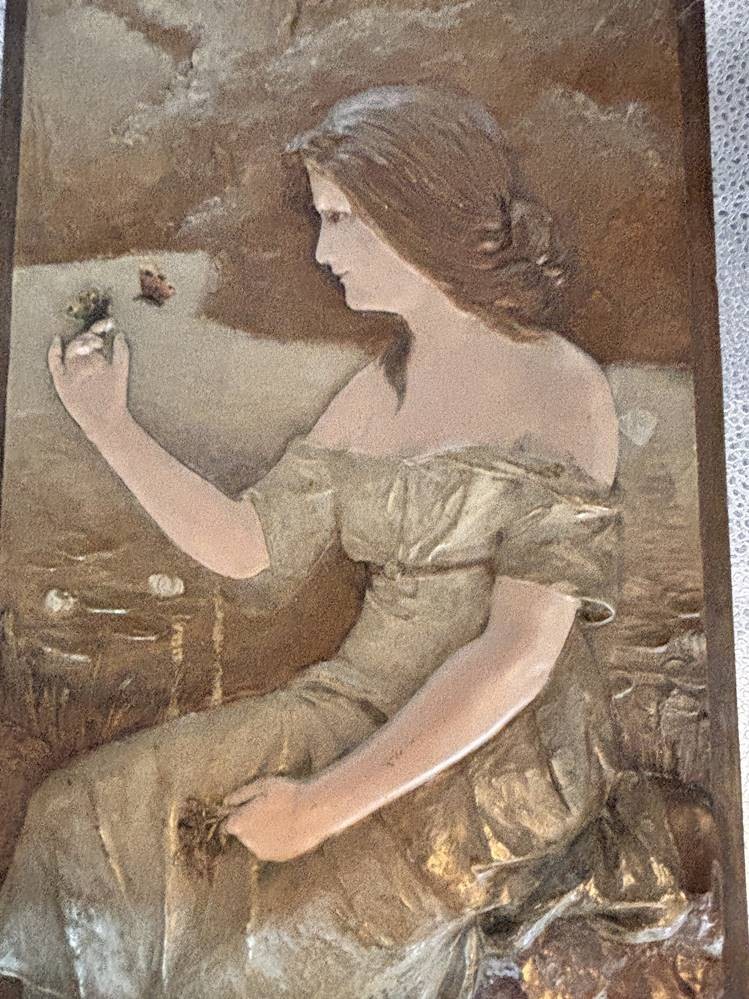 Keramik-Wandplatte mit Mädchendarstellung mit Schmetterling, verso gemarkt JM-Austria, Nr. 4523 ,wohl Johann Maresch (1821-1914), um 1880, 40x26 cm [1]