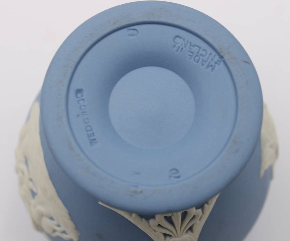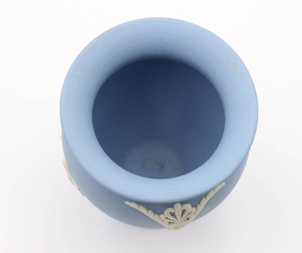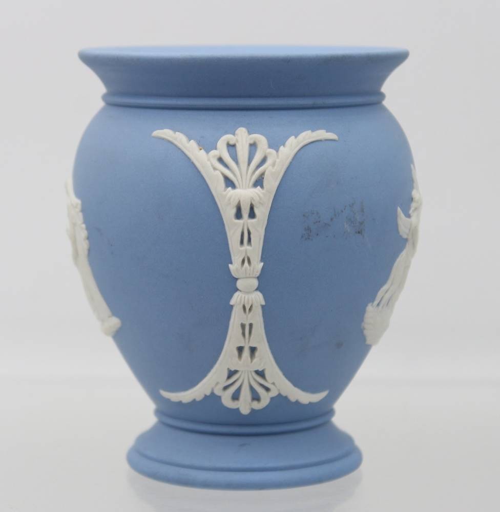 kl. Vase, Wedgwood, England, blaue mit weißen aufgelegtem Dekor, ca. H-9,8cm [1]