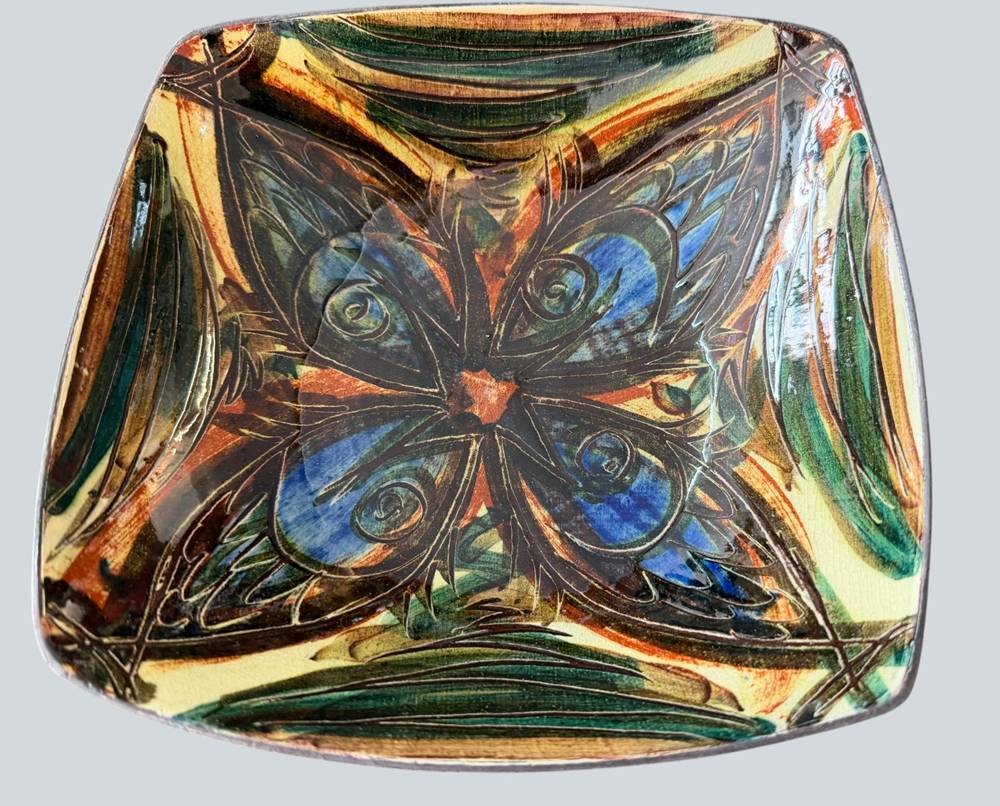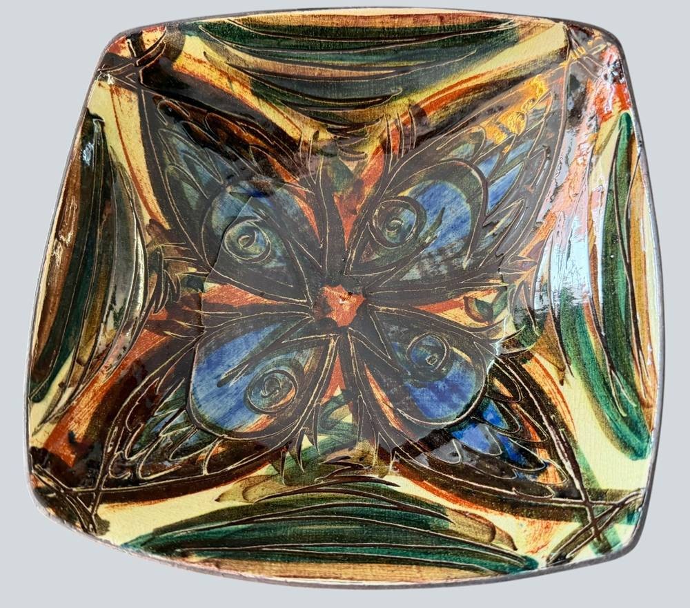 Kunstkeramik-Schale aus der Cuxhavener Keramikwerkstatt Bücking Börnsen, um 1970, H-6 cm, 20x20 cm