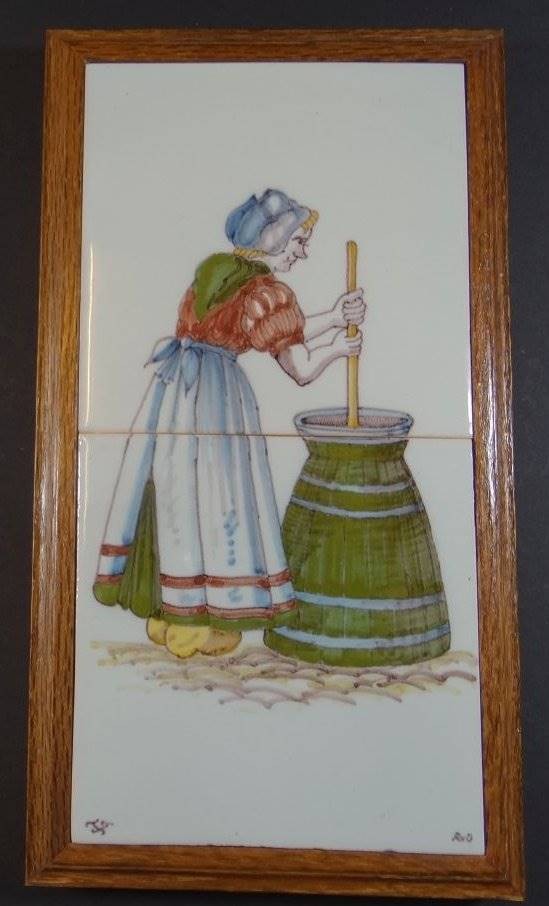Makkum Fliesenbild "Magd beim Butterstossen", gerahmt, RG 28x15 cm [1]