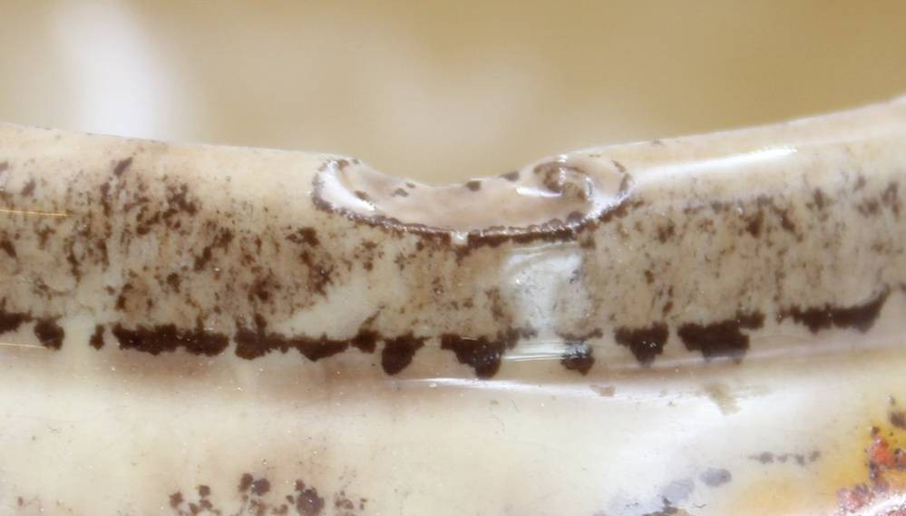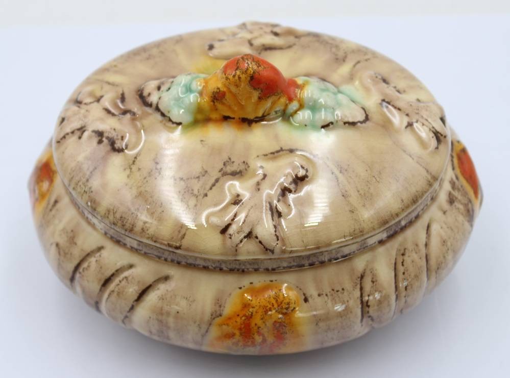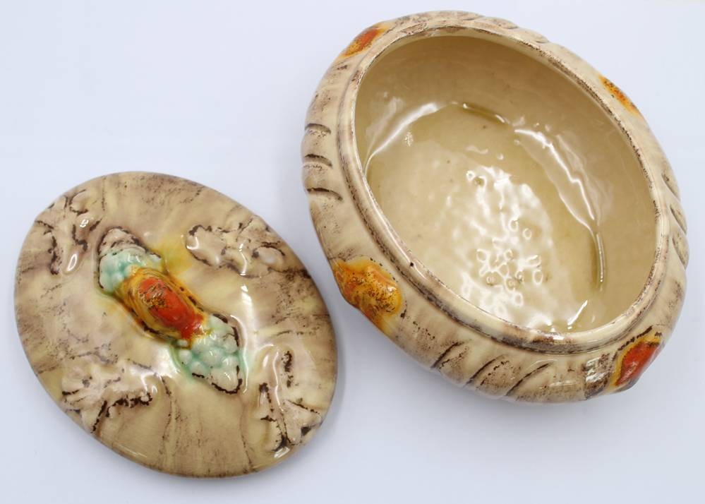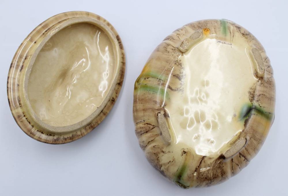 ovale Deckeldose, Laufglasur, älter, ca. H-10cm B-18cm [1]