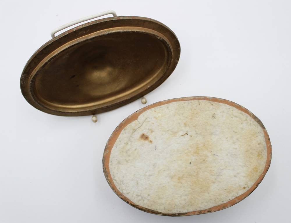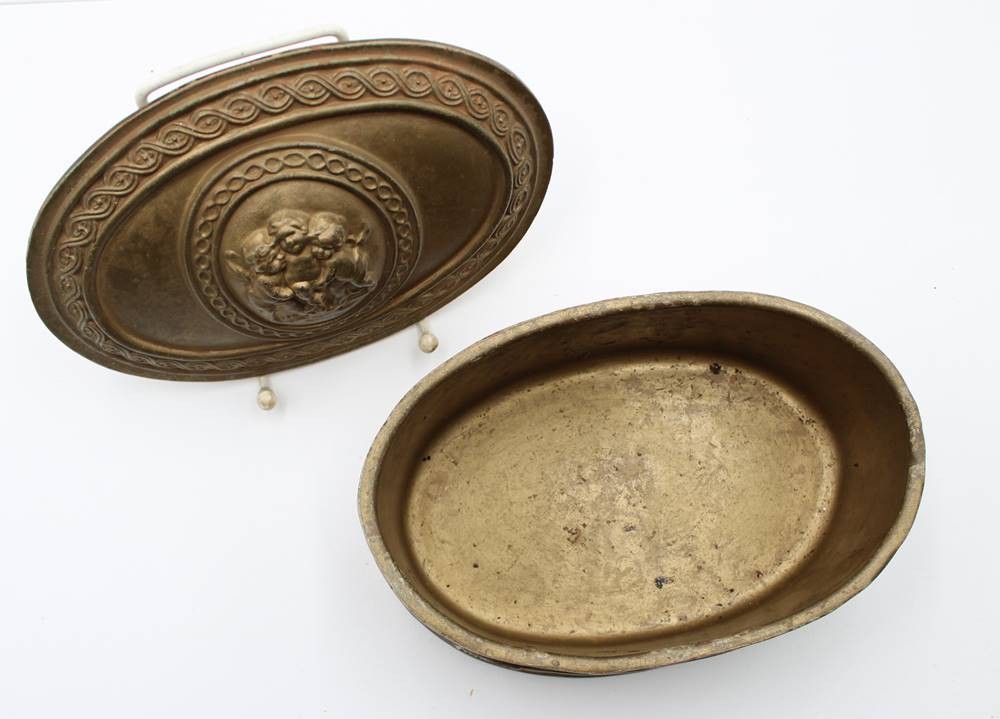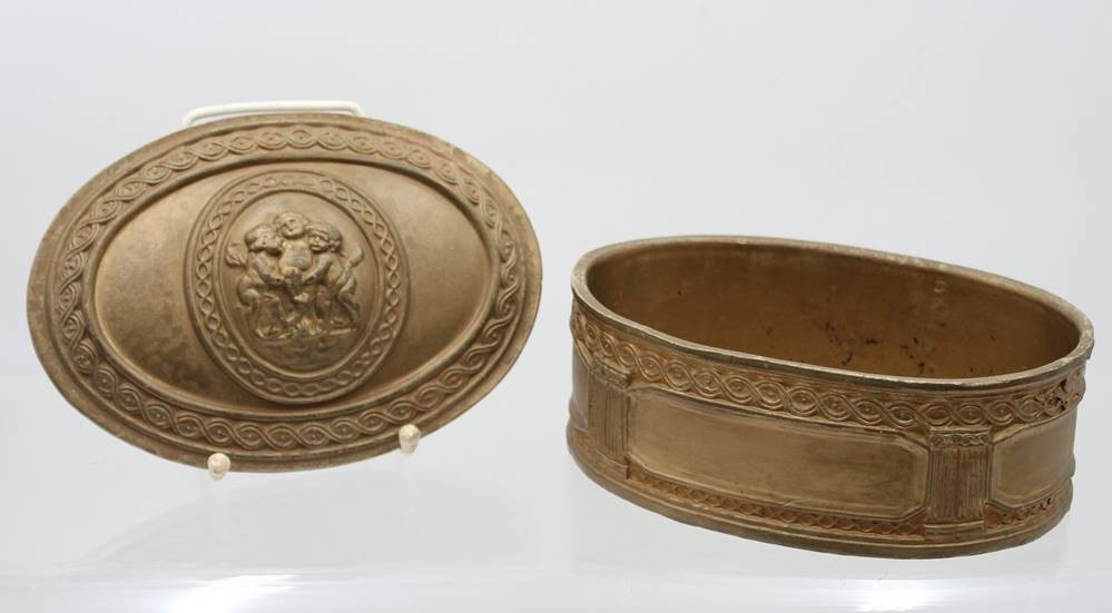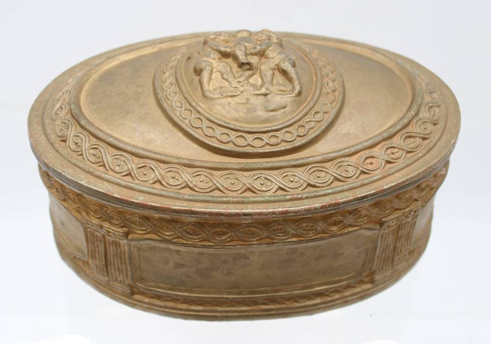 ovale Zierdose, goldfarben, wohl Italien, Deckel mit Putidarstellung, ca. H-10cm B-21cm T-15cm [1]