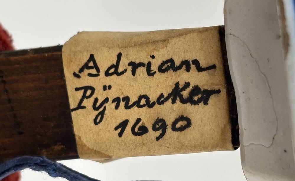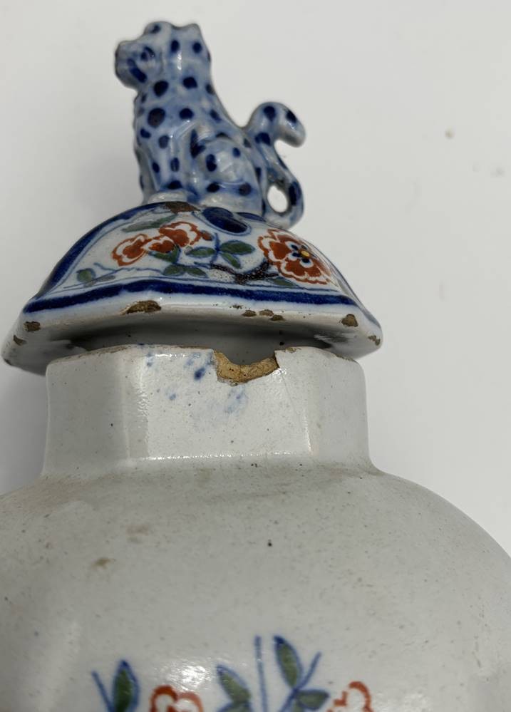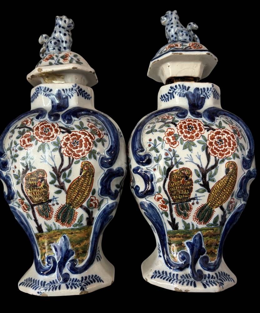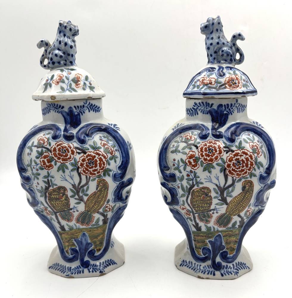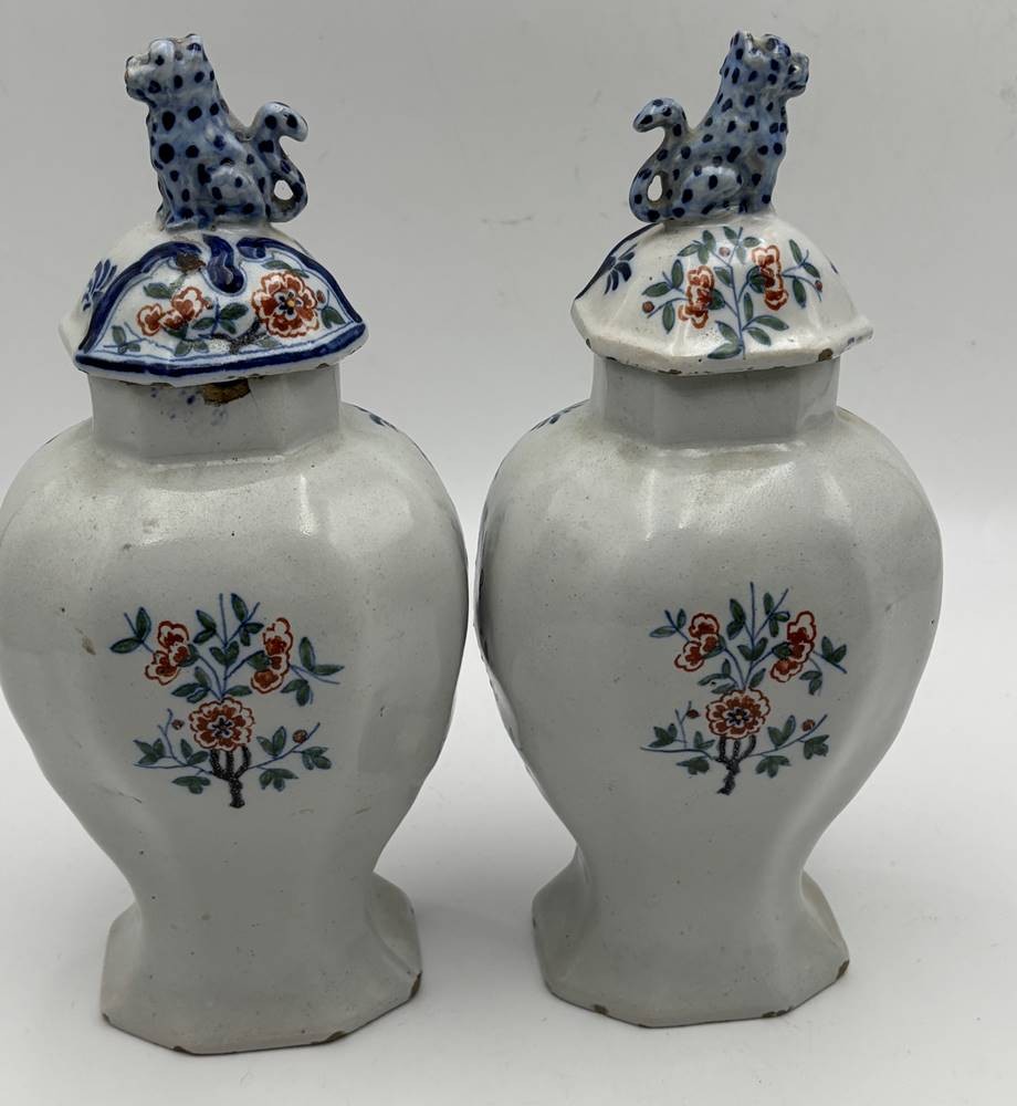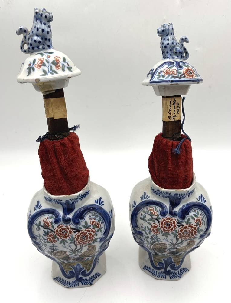 Paar antike Deckelvasen, Delft um 1690, signiert Adrian Pynacker, div. Abplatzer etc., mit Deckelschutzvorrichtung, H-25 cm [1]