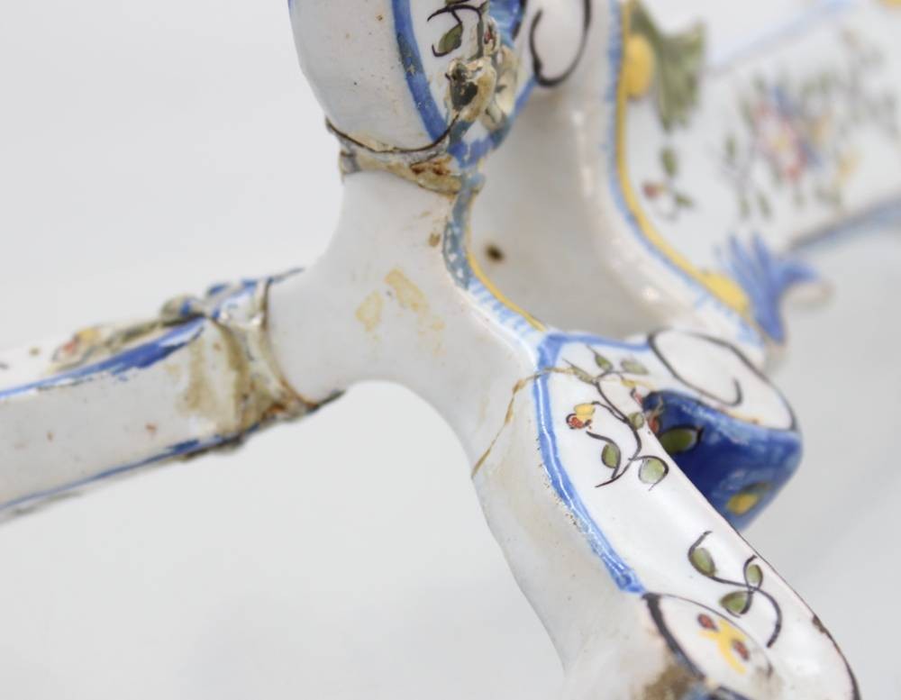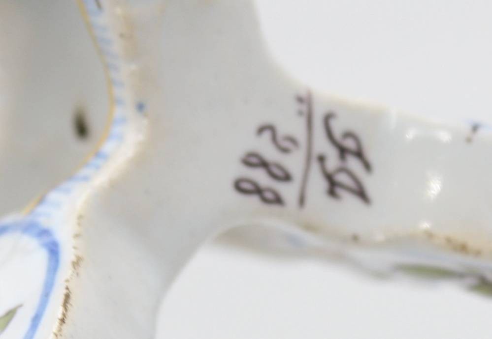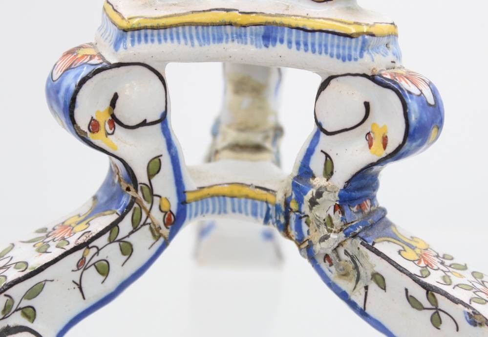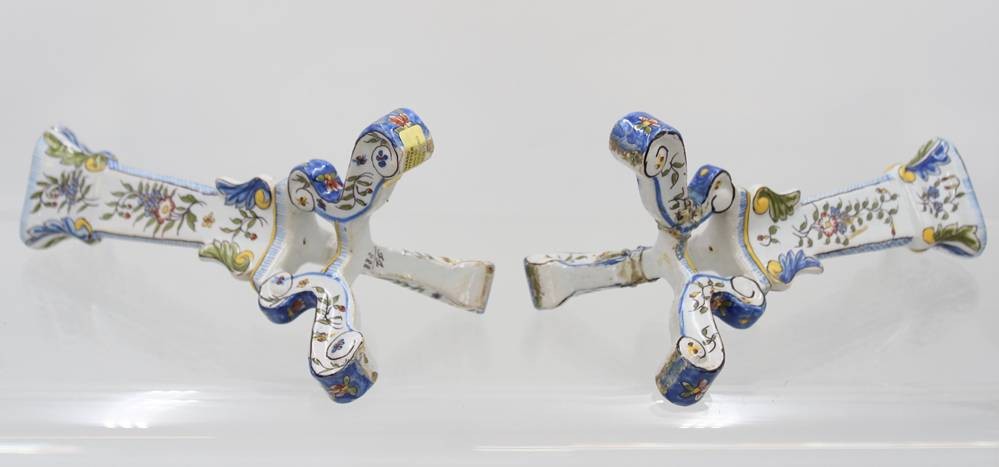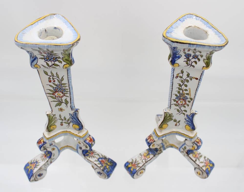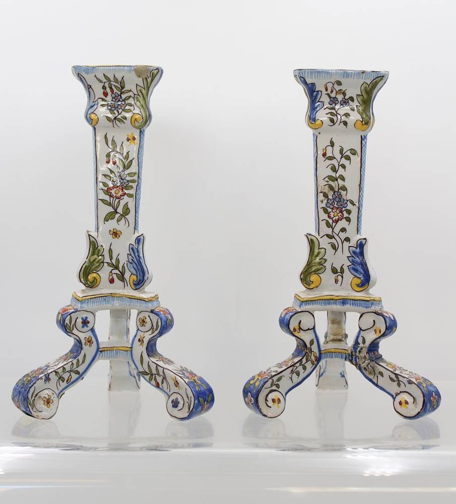 Paar Fayence Kerzenständer mit Blumenbemalung, wohl Frankreich um 1900, 1x mehrfach geklebter Stand, 1x gut erhalten, Monogramm H-22 cm [1]