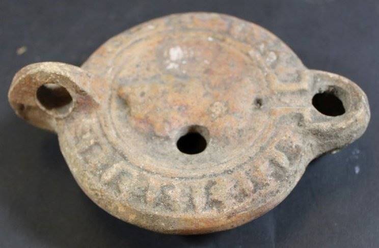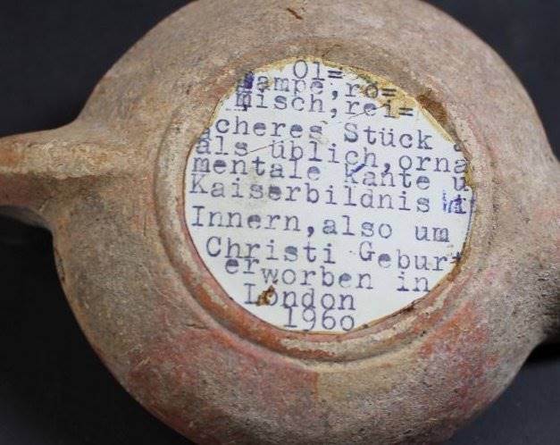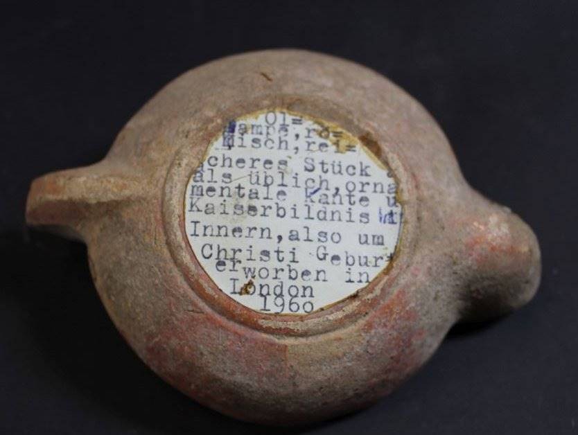 römische Öllampe um Christi Geburt, verso beschriftet vom Käufer? gekauft 1960 in London, [1]