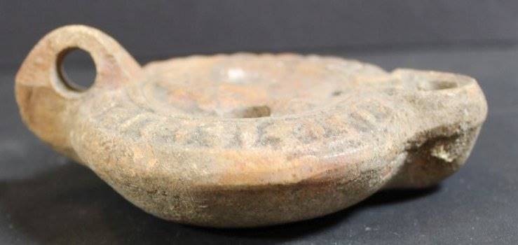 römische Öllampe um Christi Geburt, verso beschriftet vom Käufer? gekauft 1960 in London,