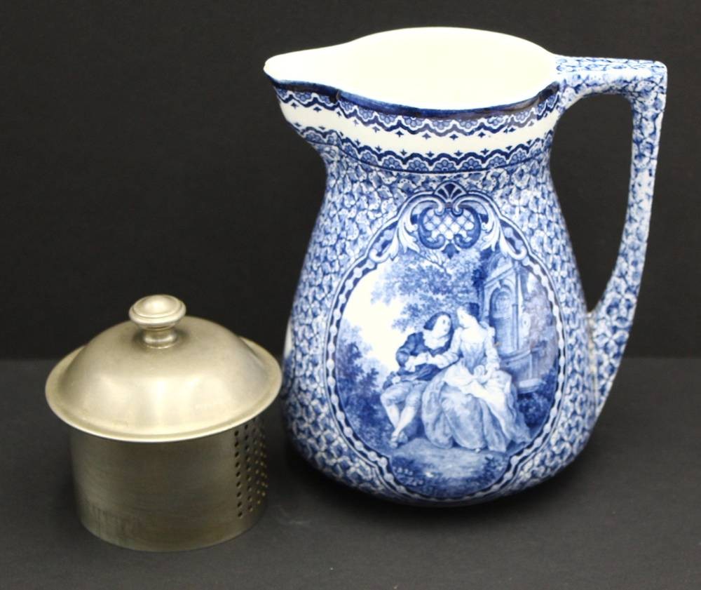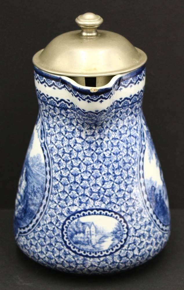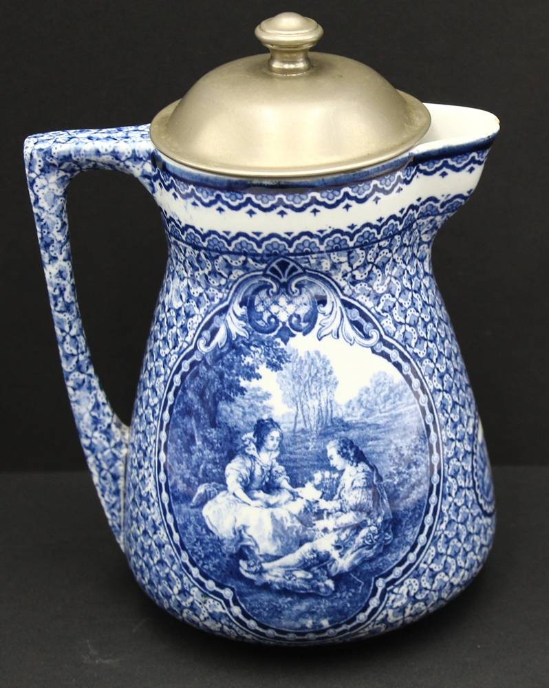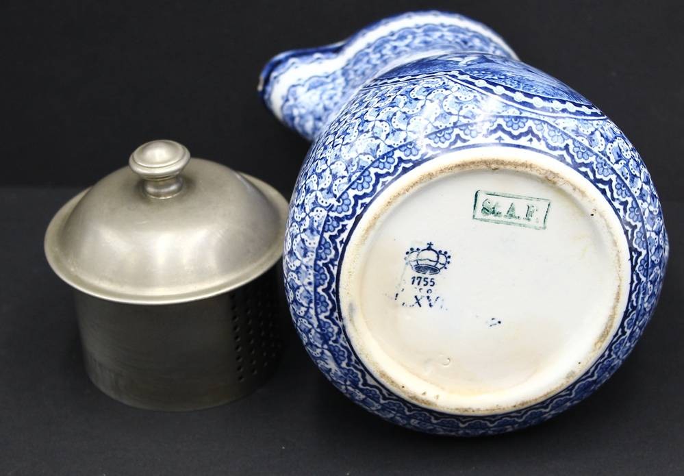 Schokoladenkanne mit nMetall-Deckel und Sieb, H-18 cm, minimaler Abplatzer am Ausguss [1]