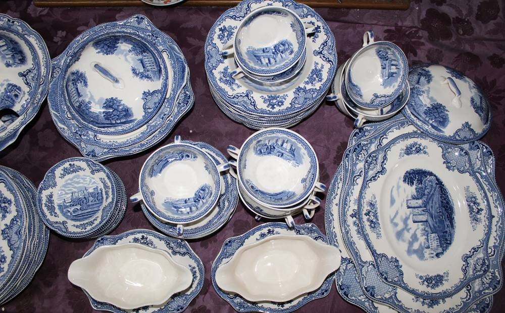 Speiseservice Johnson Bros England Old Britain Castles für 12 Personen, je 12 flache, 12 tiefe Teller, 12x Suppentassen mit 12 U.T., 12 Beilagen-Schälchen, 5x verschieden grosse Schalen, davon 3x mit Deckel, 4x div. Platten, 2x Saucieren, 1 kl. Schälchen, 74 Teile, nur 2 Teile minimale Chips, [1]