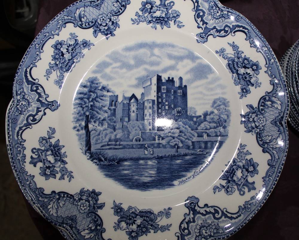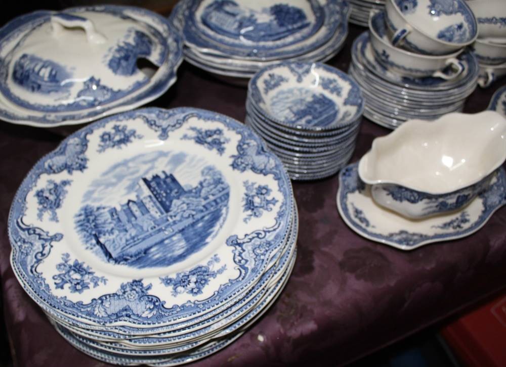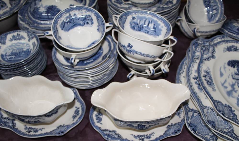 Speiseservice Johnson Bros England Old Britain Castles für 12 Personen, je 12 flache, 12 tiefe Teller, 12x Suppentassen mit 12 U.T., 12 Beilagen-Schälchen, 5x verschieden grosse Schalen, davon 3x mit Deckel, 4x div. Platten, 2x Saucieren, 1 kl. Schälchen, 74 Teile, nur 2 Teile minimale Chips,