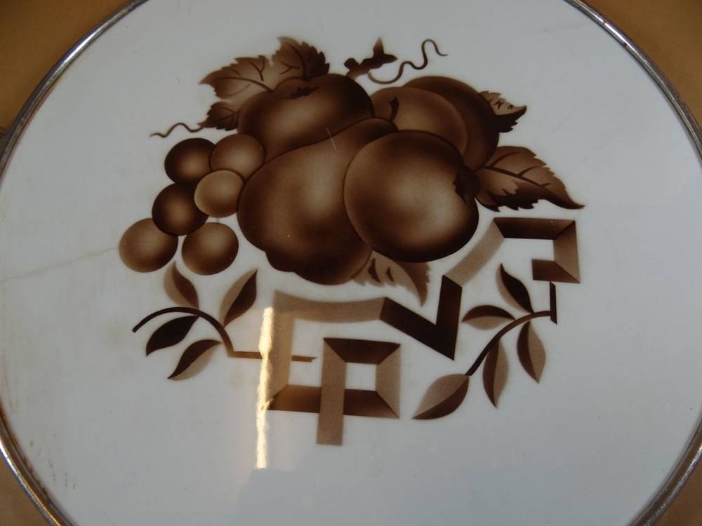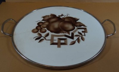 Tortenplatte, Keramikboden und Metallmontur, Altriss, Gebrauchsspuren, B-36 cm [1]