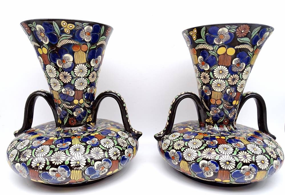 Vasen Paar gemarkt" Thoune " , Blumendekor, 1x oberer Rand mit Chip, ca. H-29cm [1]