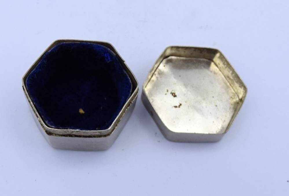 kleine Pillendose aus Metall mit Blauem Samt ausgelegt verziert mit Plättchen aus Perlmutt und Schildpatt Ø 3,2 cm H. 2,5 cm [1]
