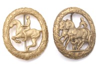 2x Reiterabzeichen, verso Hersteller, 1x Nadelsystem restauriert