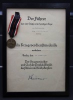 Kriegsverdienstmedaille am Band mit Verleihungsurkunde, gerahmt, RG 32 x 23cm
