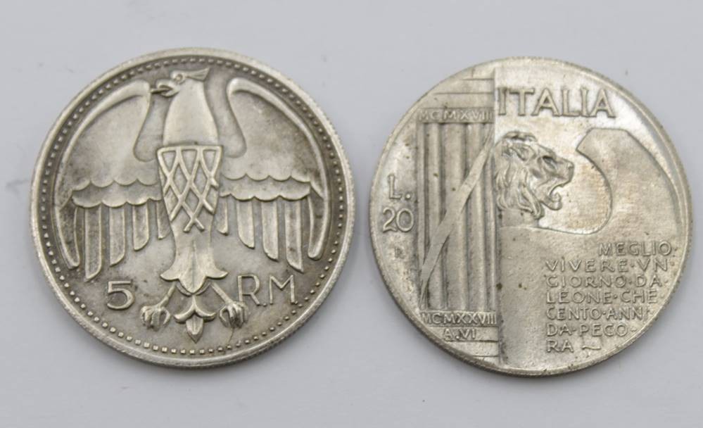 2x div. Medaillen, Sammleranfertigungen, Mussolini u. 5 RM A. Hitler, je D-3,5cm. [1]
