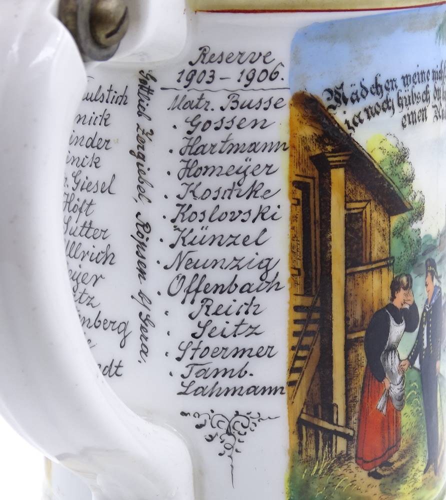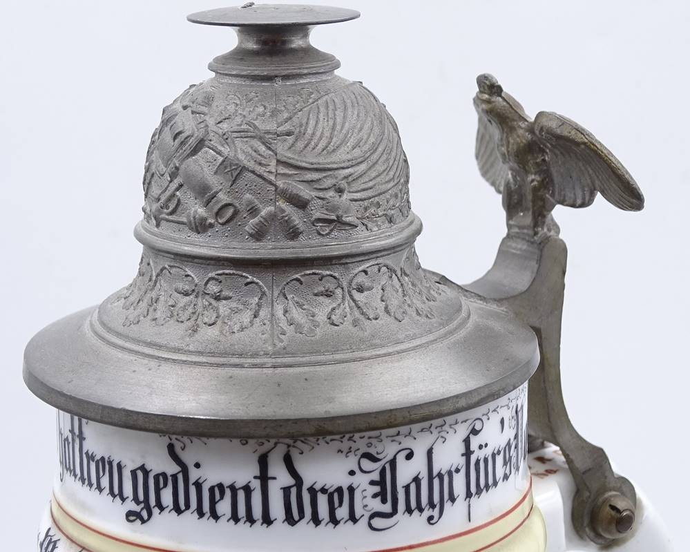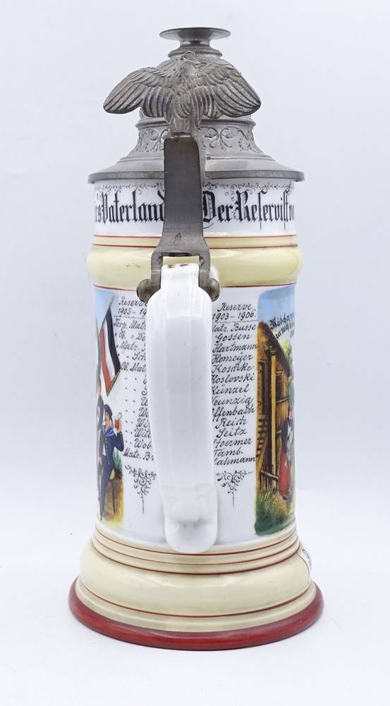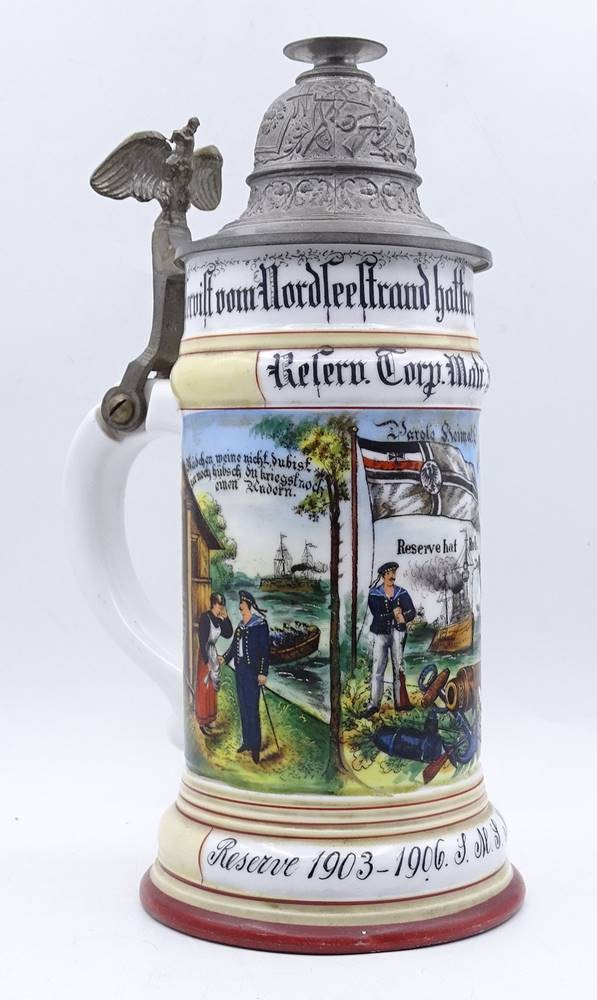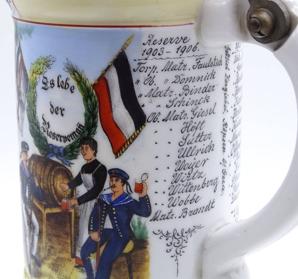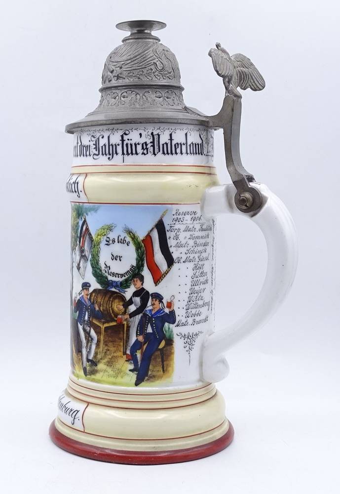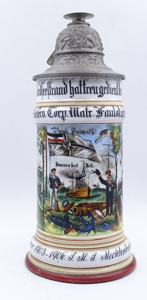 Reservistenkrug Reserve 1903 - 1906 S.M.S. Mecklenburg, Zinndeckel, aufgesetztes Stück fehlt!, Lithophanie im Boden, auf Griff mit Stempel DRGM No. 26364, H. 25cm [1]