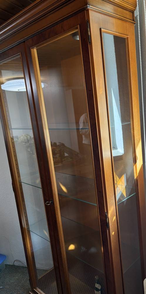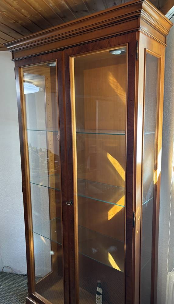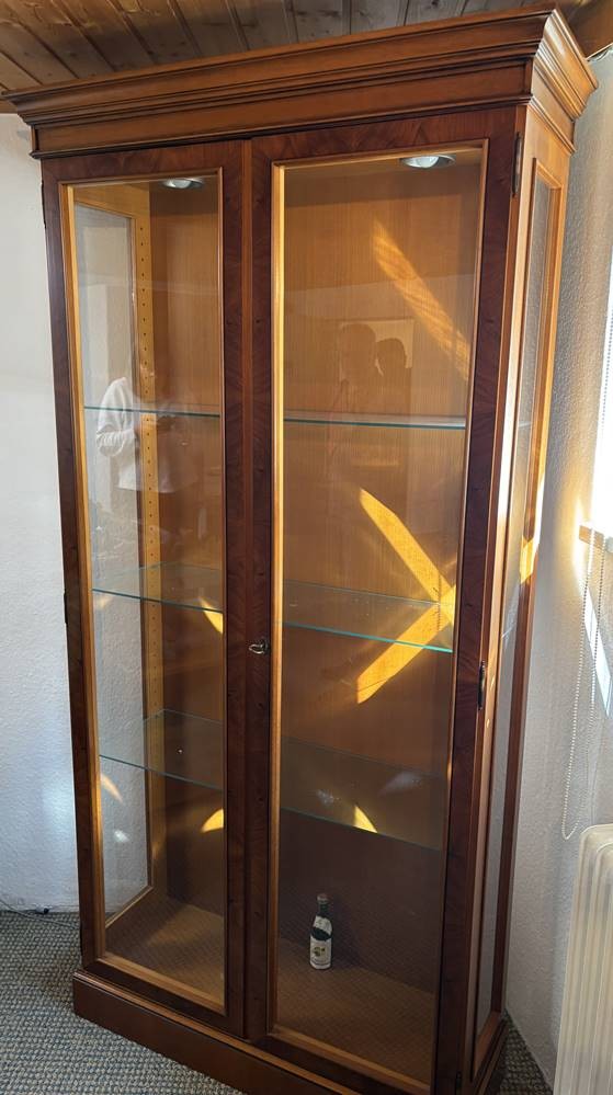2 tg. Mahagoni-Vitrine, beleuchtbar, 3 seitig verglast, H-ca. 200 cm, B-ca. 105 cm [1]
