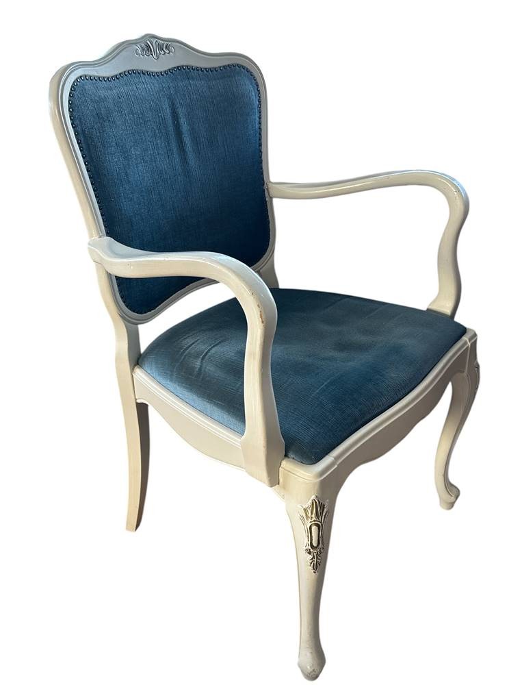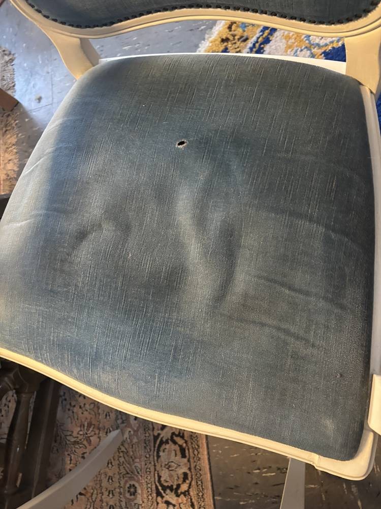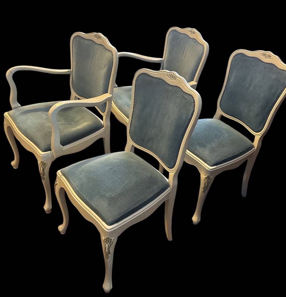 4 Stil-Esszimmerstühle, 2x davon mit Armlehnen, 1x Bezug mit Brandloch, H-94 cm, B-max. 62 cm [1]