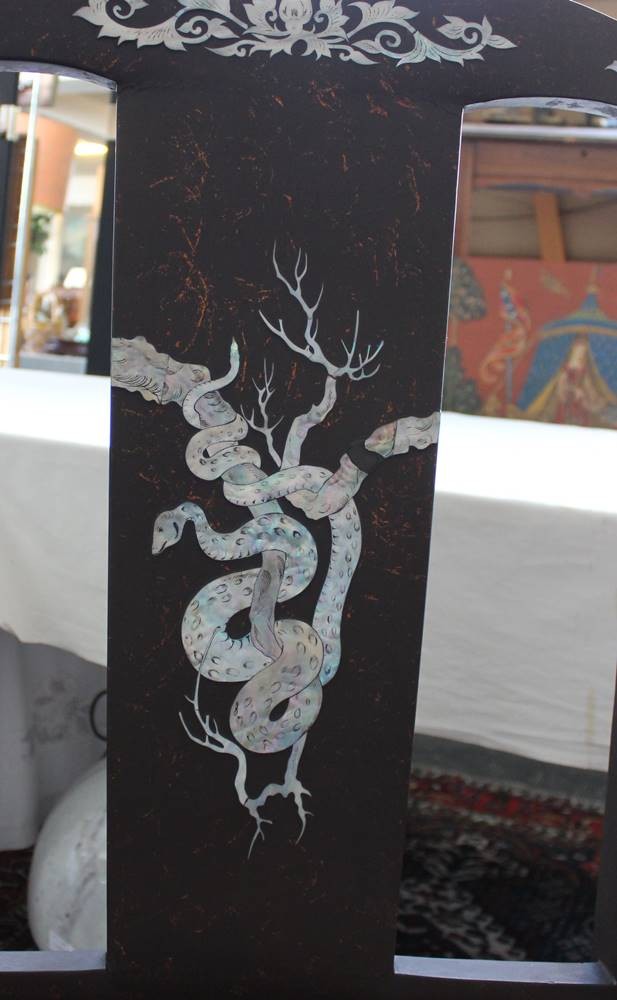 4x Stühle, China, Perlmuttauflagen, Lack, teilw. Gebrauchsspuren, je ca. H-109,5cm B-47cm Sh-47cm