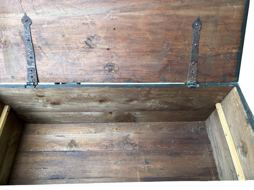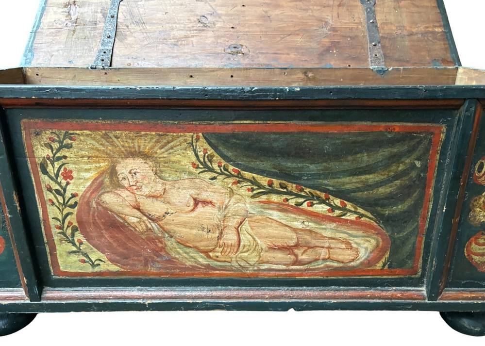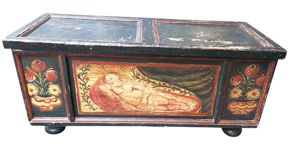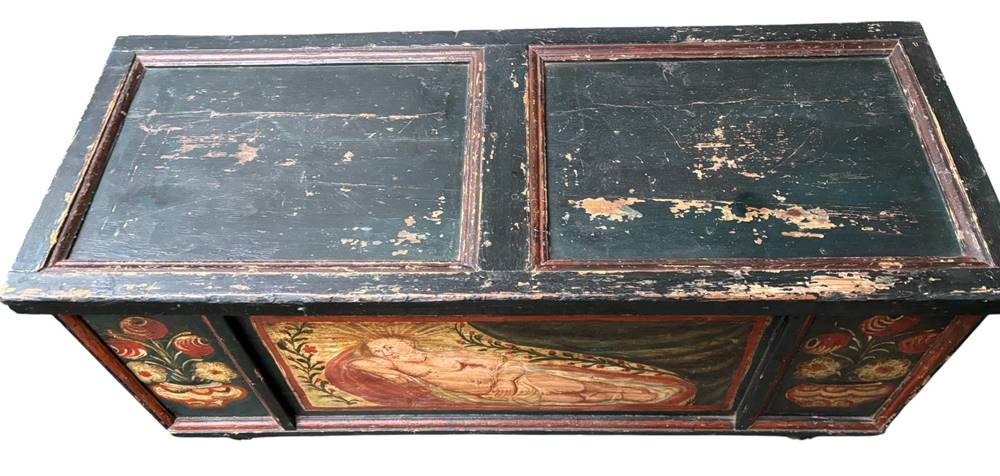 alpenländische Holztruhe mit Bemalung, um 1850, Gebrauchsspuren, L-119 cm, T-48 cm, H-54 cm [1]