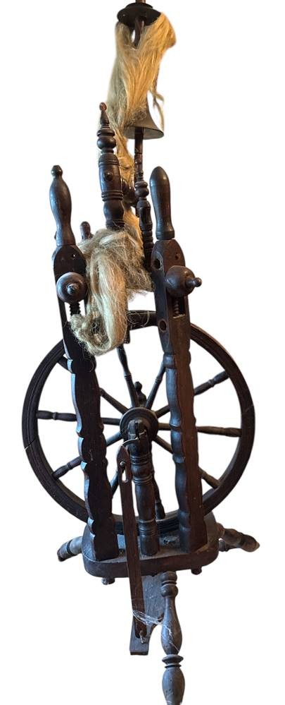 altes Spinnrad, Holzgestell tlw. gedrechselt und beschnitzt 2. Hälfte 19. Jh. Höhe ca. 120 cm. Alters und Gebrauchsspuren [1]
