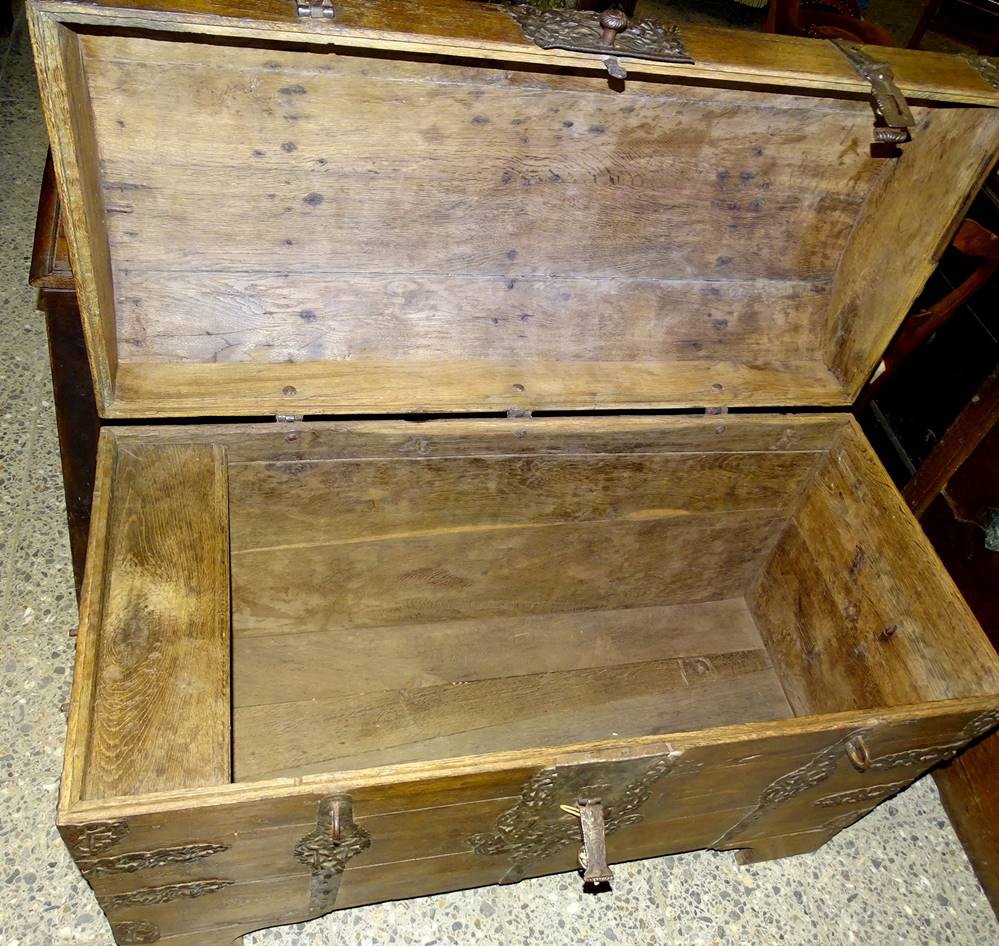 +Barock-Runddeckeltruhe mit Eisenbeschlägen, H-93 cm, B140 cm, T-73 cm